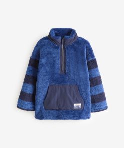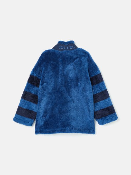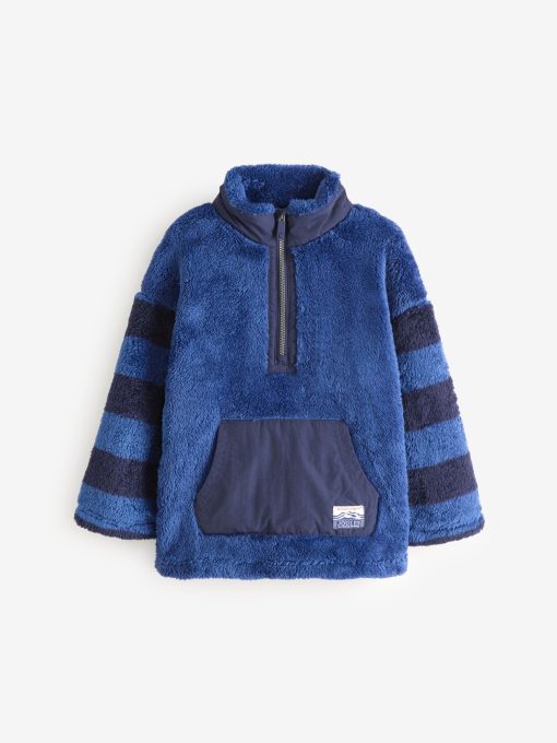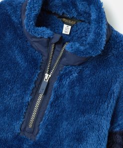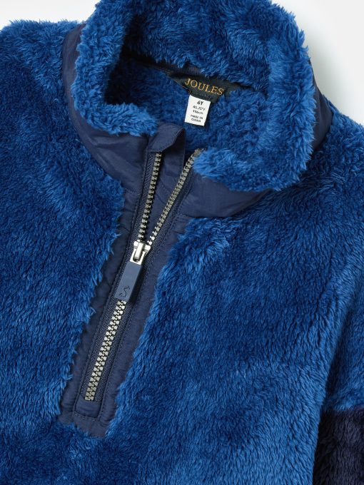 When the temperatures drop but the outdoor fun continues, the Always Cosy Blue fleece will be their favourite thing to wear. It's crafted from fleece so soft they'll feel as though they're wearing a cloud and has a funnel neck for snuggling into. As practical as it is warm, it has a quarter zip fastening with silicone pull, a woven kangaroo pocket to the front and a relaxed fit leaving room for handy layers underneath. It's finished with Joules branded embroidery behind the neck and a woven tab to the pocket. Cosy fleece Relaxed fit Dropped sleeves Funnel neck with embroidered branding to the back neck Half zip fastening with silicone pull Colour block design Woven kangaroo pocket with Joules tab