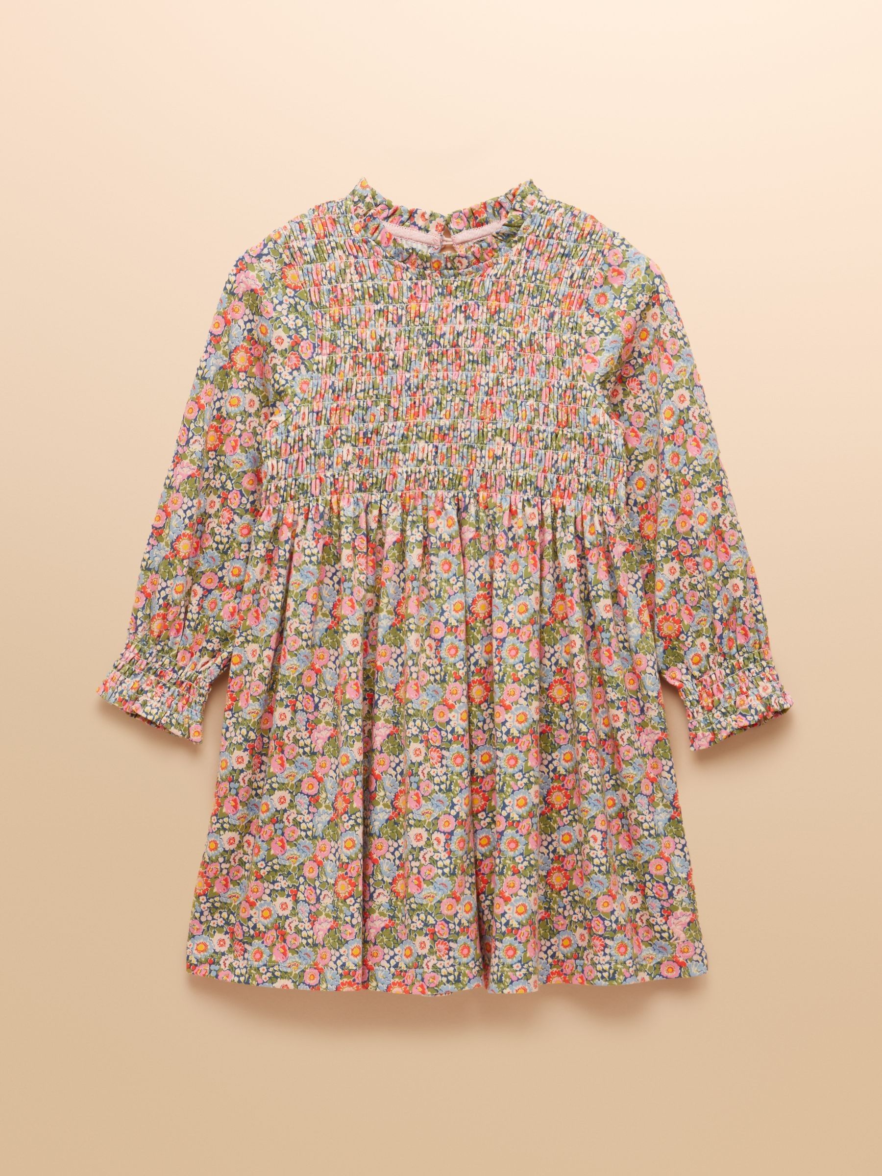 Made from quality cotton and adorned with a print your little one will love, this is a dress they'll want to wear, quite literally, everywhere. It's cut to an a-line shape, has long sleeves and a gathered waist which creates fullness through the skirt and a twirl-worthy effect. The shirred detailing to the front and back bodice adds stretch and comfort, while a frilled neckline creates a pretty finish. The cuffs feature a matching frill and shirred detailing too. This is a perfect dress to move their wardrobe into the lighter and brighter season. Shirred front and back yoke. Gathered waist. Long sleeves with shirred cuffs and frilled trim. Round frilled neck. Keyhole button fastening to the back.