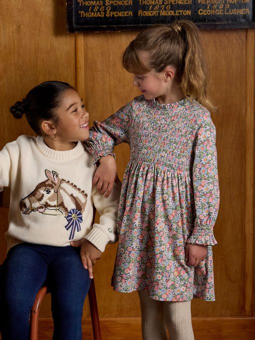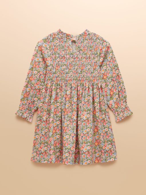 Made from quality cotton and adorned with a print your little one will love, this is a dress they'll want to wear, quite literally, everywhere. It's cut to an a-line shape, has long sleeves and a gathered waist which creates fullness through the skirt and a twirl-worthy effect. The shirred detailing to the front and back bodice adds stretch and comfort, while a frilled neckline creates a pretty finish. The cuffs feature a matching frill and shirred detailing too. This is a perfect dress to move their wardrobe into the lighter and brighter season. Shirred front and back yoke. Gathered waist. Long sleeves with shirred cuffs and frilled trim. Round frilled neck. Keyhole button fastening to the back.