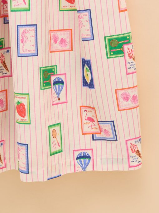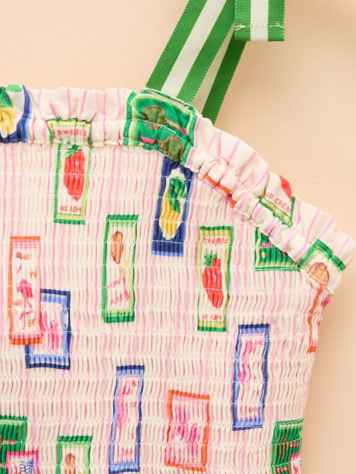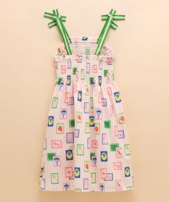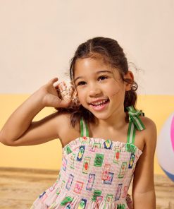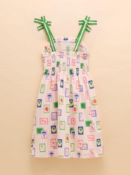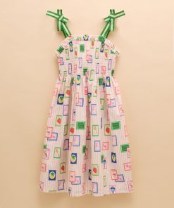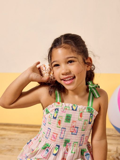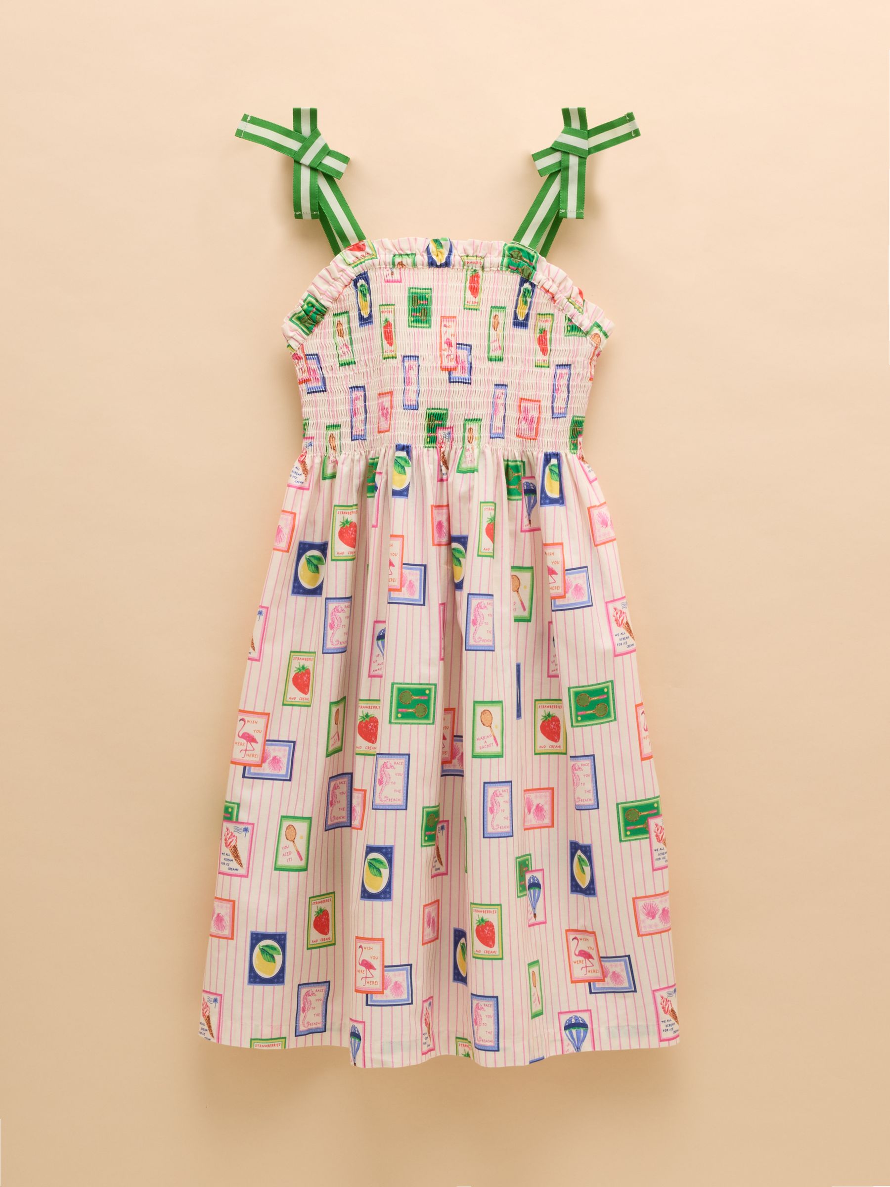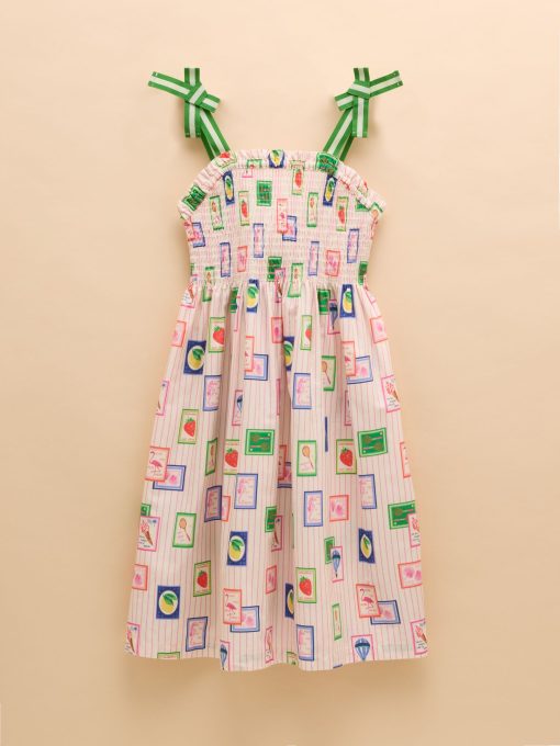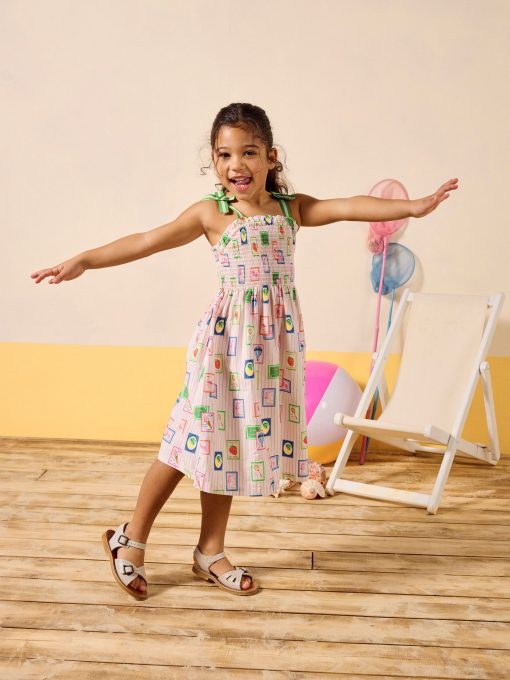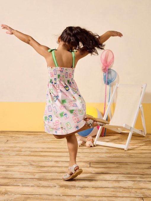 Warm weather calls for sundresses, and this one, as the name suggests is as pretty as a picture! Whether your little one has a host of parties to attend, or you're looking for easy-to-pack pieces for a summer holiday, this one ticks all the boxes. It's made from a light and breathable cotton fabric and has an A-line shape and a gathered waist for fullness. The shirred front and back bodice is curved with a frilled trim and the fixed ribbon straps are in a contrasting colour for an oh-so-pretty finish. Cotton A-line shape Below the knee length Shirred front and back bodice with frill trim Contrasting colour ribbon straps Gathered waist