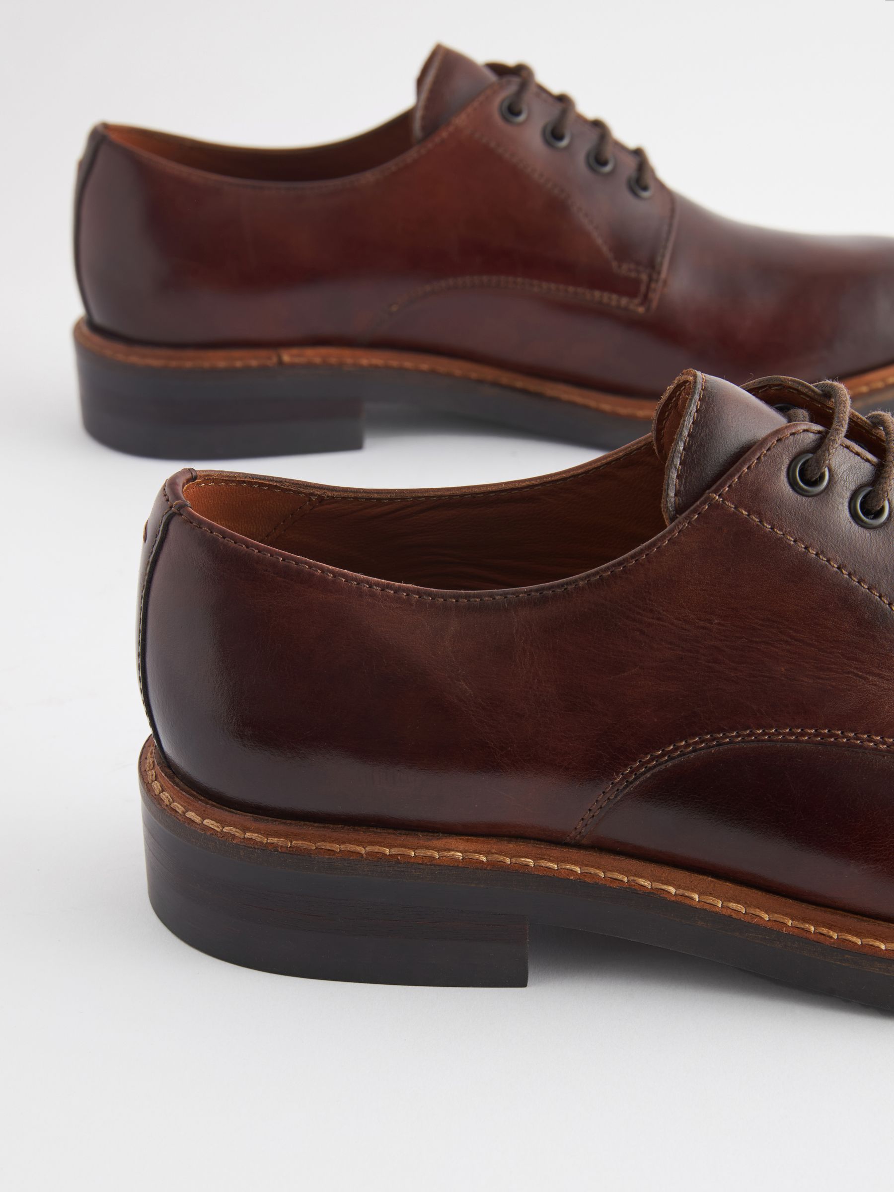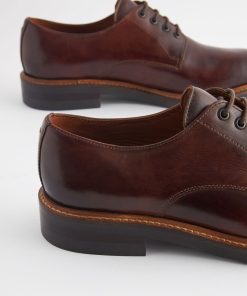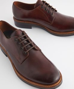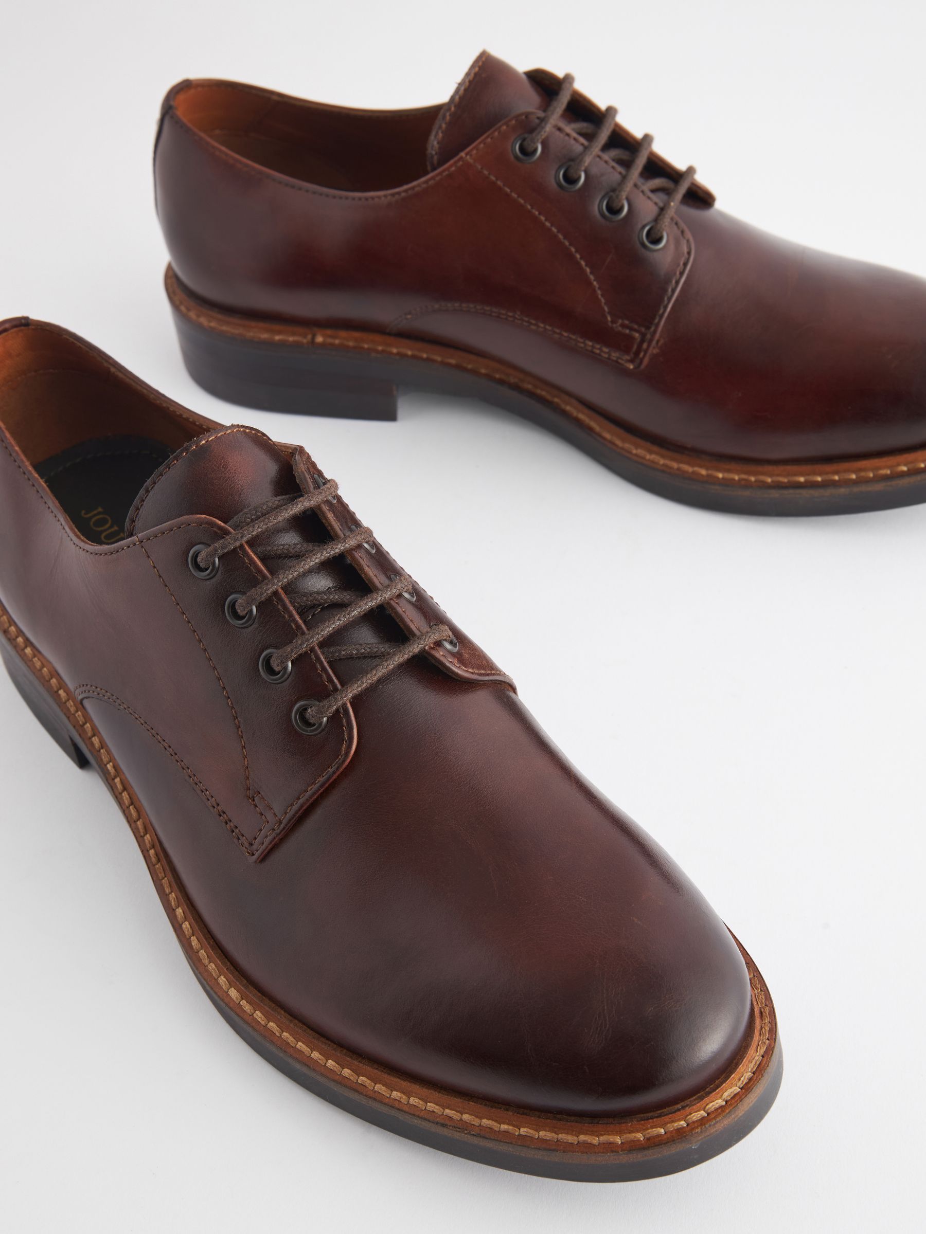 This product has a smaller fit compared to typical Next garments. With open laces and a relaxed look, Brown leather Derby shoes offer a more casual alternative to Oxfords. Crafted from leather uppers that have been polished for a high-shine finish, this pair will stand out in your footwear collection. The rich brown colour of the leather enhances their versatility and an Ortholite insock ensures every step is a comfortable one. They're finished with Dainite soles and a contrasting leather. Refined and stylish Polished leather uppers Dainite soles Interest leather rand Leather lining Ortholite comfort insock Open laces
