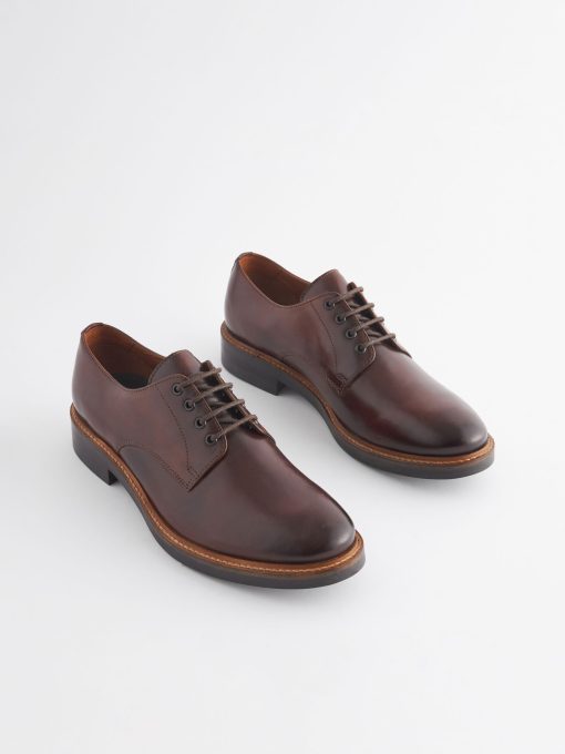 This product has a smaller fit compared to typical Next garments. With open laces and a relaxed look, Brown leather Derby shoes offer a more casual alternative to Oxfords. Crafted from leather uppers that have been polished for a high-shine finish, this pair will stand out in your footwear collection. The rich brown colour of the leather enhances their versatility and an Ortholite insock ensures every step is a comfortable one. They're finished with Dainite soles and a contrasting leather. Refined and stylish Polished leather uppers Dainite soles Interest leather rand Leather lining Ortholite comfort insock Open laces