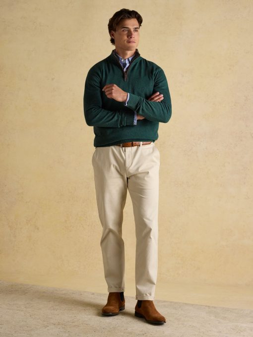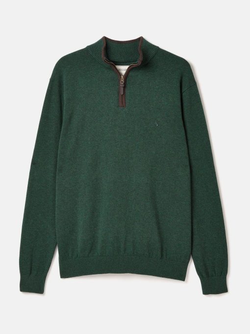 One of our best-loved men's styles, this quarter zip jumper in dark green is crafted from soft yet substantial cotton and is comfy enough for layering and yet dapper enough to wear on its own.The contrast back-neck is ribbed, as are the hem and the cuffs. We recommend pulling it on over a shirt for ultimate style, warmth and comfort. Perfect for those smart-casual occasions that can be tricky to dress for.Cotton Classic fit Funnel neck with quarter zip fastening Faux leather zip pull Ribbed hem, neck and cuffs Contrast back neck tape