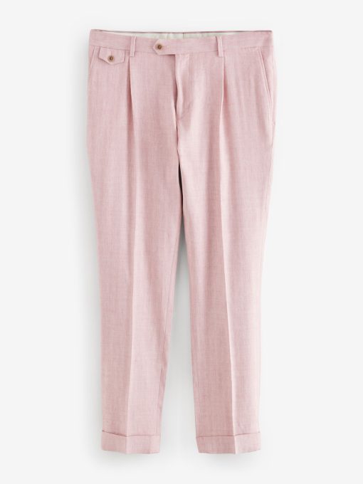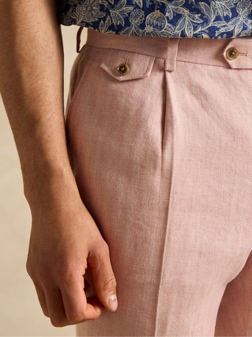 Since the 1960s, Nova Fides has been based in the Prato textile district, creating fine weaves and fabrics for Men's clothing. Attend those summer events in style and comfort with a pair of linen trousers. Cut from 100% Italian linen, these are an enduring style that will live long in your wardrobe. They have a tapered fit through the leg, turn-up cuffs, belt loops and a single pleat through the leg for a polished look. Finished with side pockets and two welt pockets with buttons to the rear. Pairing them with the matching linen blazer is always the best choice for formal occasions, but can easily be styled with a cotton T-Shirt or linen shirt to achieve a smart casual look. Half lining Lapel collar Double welt pockets Kissing buttons to the cuffs