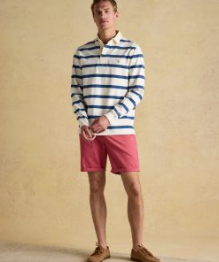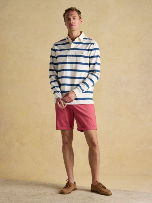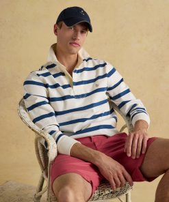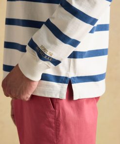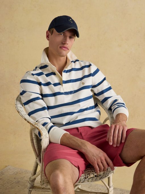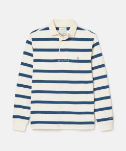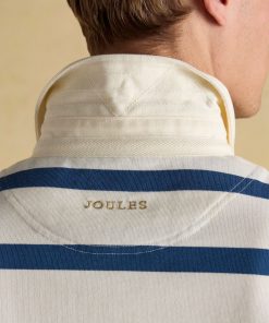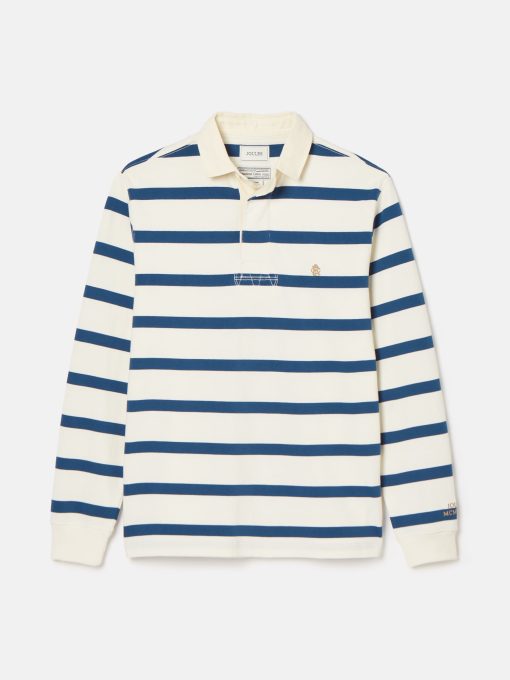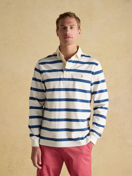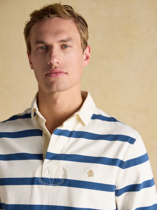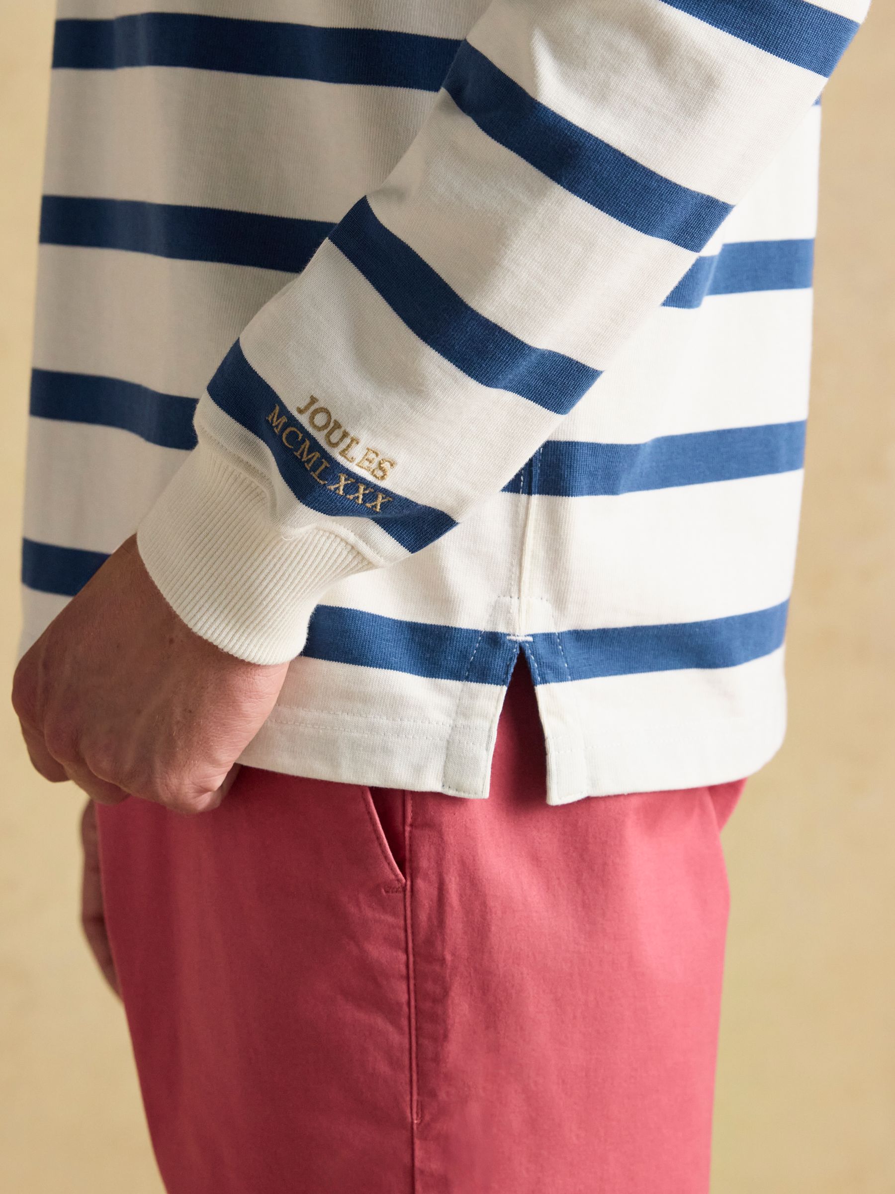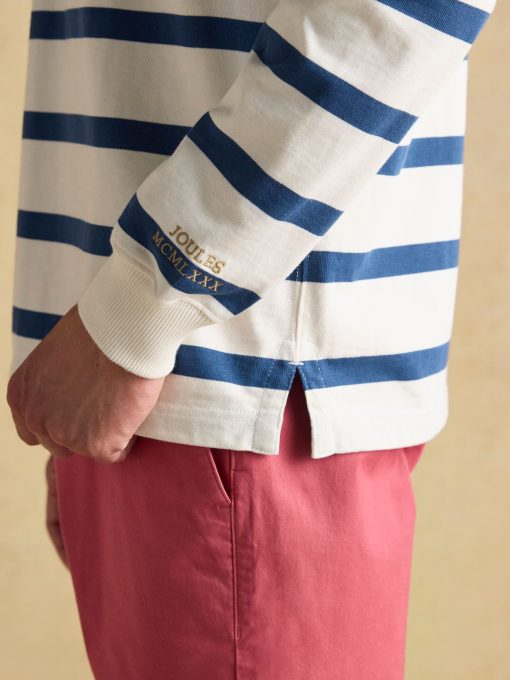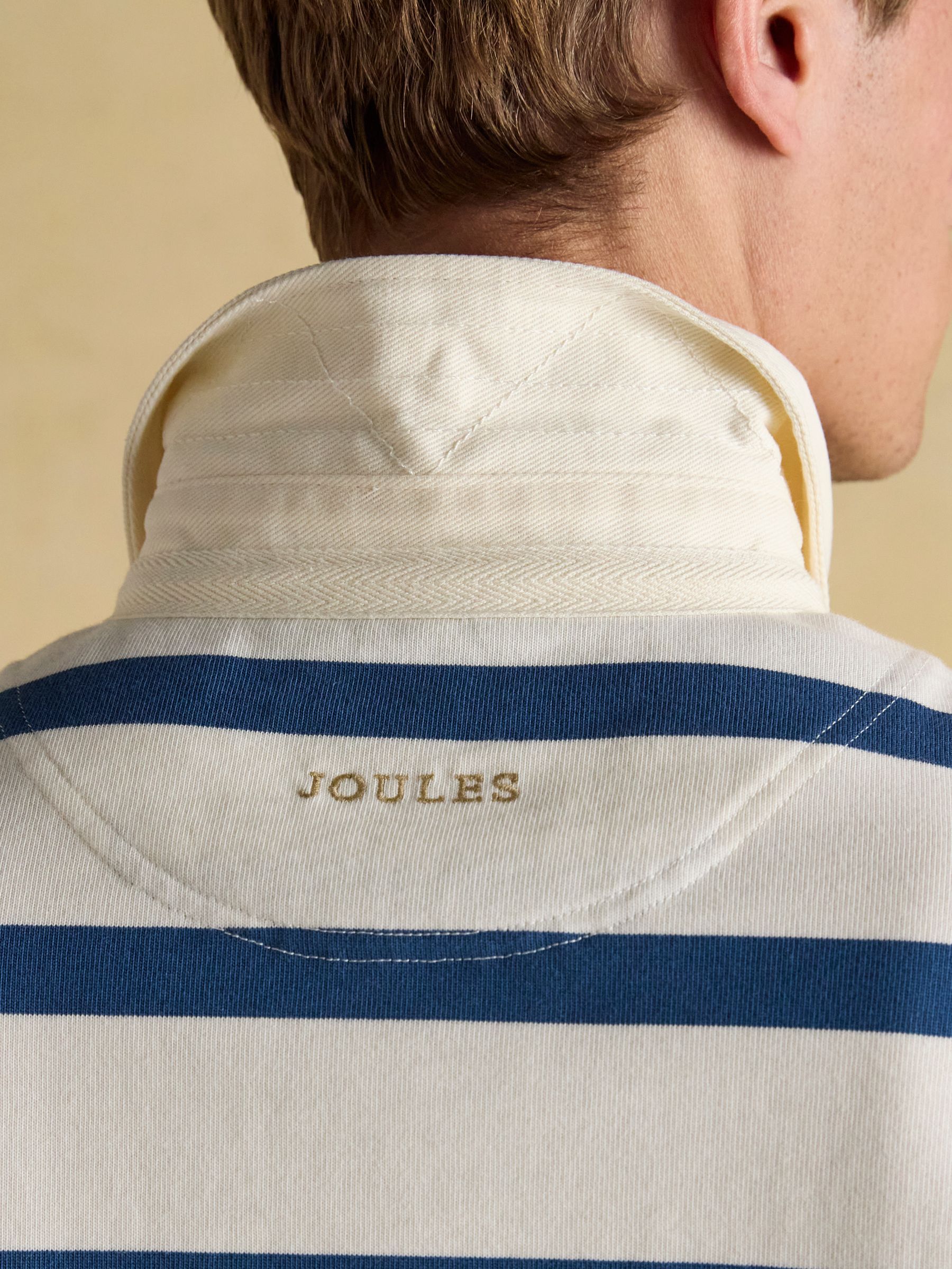 An iconic style that has lived long in men's wardrobes, the Onside rugby cream & blue shirt carries a preppy yet sporty look.It features the hallmarks of a traditional rugby shirt including a heavyweight cotton jersey construction, a concealed placket with rubber buttons, a pointed twill collar with undercollar stitching and wide horizontal stripes.Crafted with premium fabric, it's a hardwearing style that will be part of your off-the-field attire for a long time. It's finished with Joules Rugby Club embroidery to the chest, side splits, ribbed cuffs and reinforced top stitching to the placket. Pick it up in an assembly of colours. Cotton Heavyweight jersey Twill collar with undercollar stitching Concealed button placket Traditional rubber buttons Side splits Ribbed cuffs Joules Rugby Club embroidery to the chestStriped