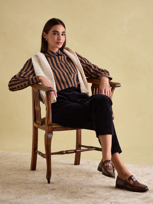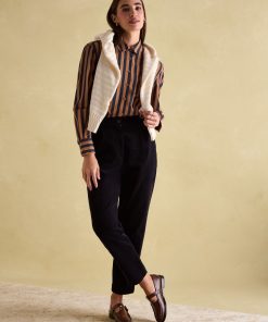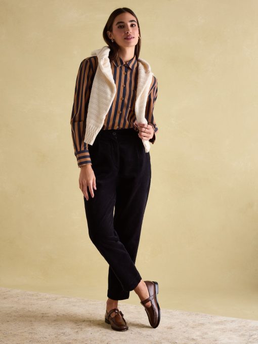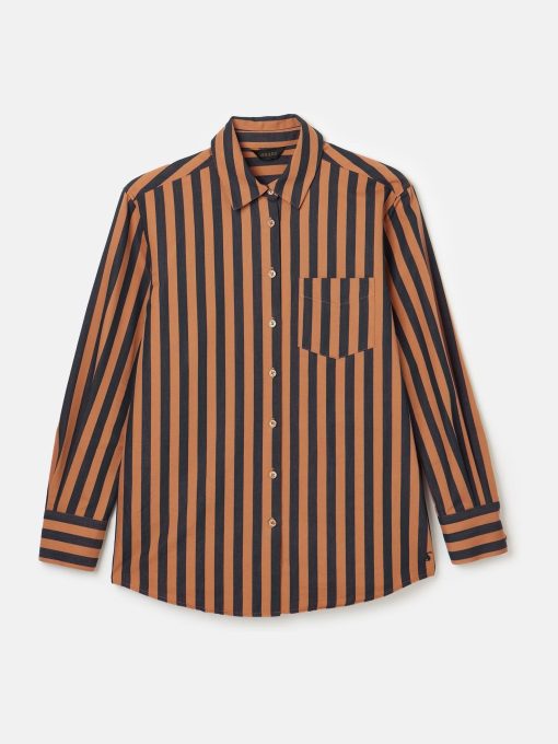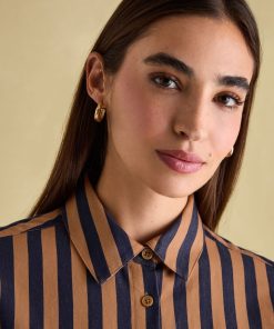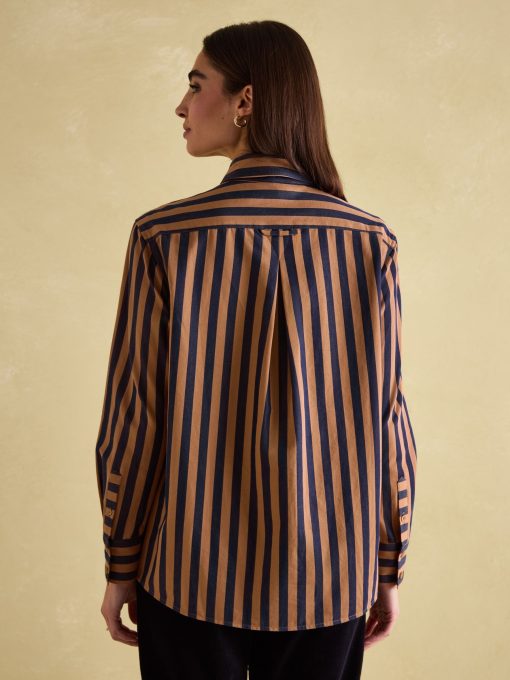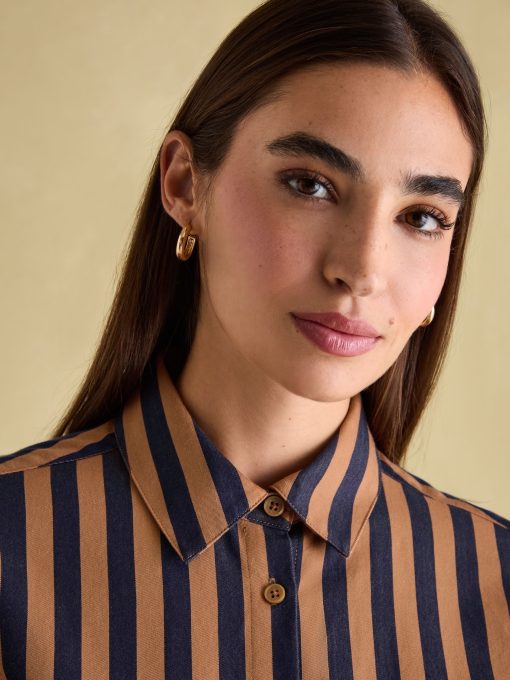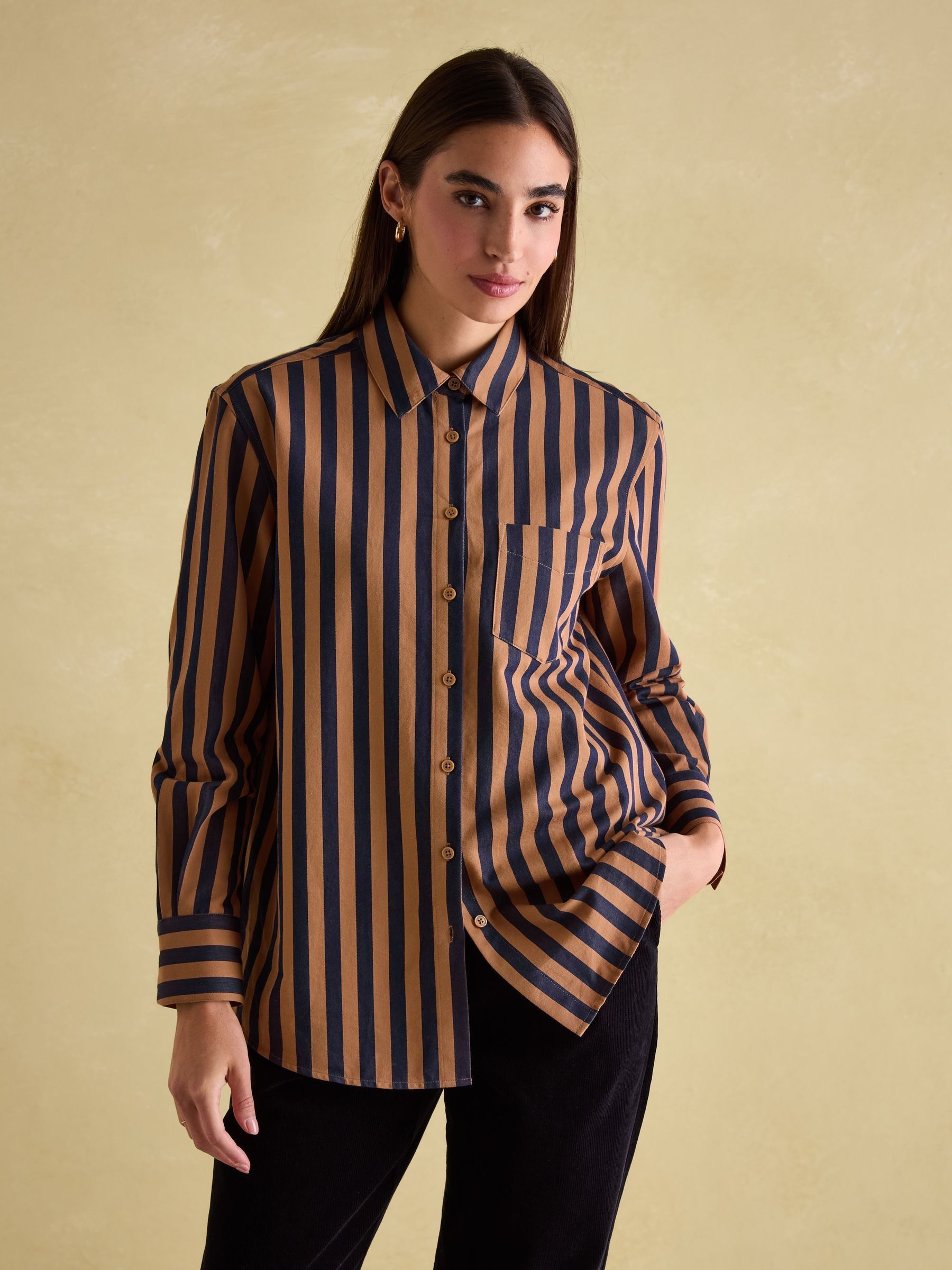 Your favourite shirt from the summer has been updated for the autumn and winter season in an array of new Navy & Tan stripes. The Amilla is made from a crisp 100% cotton, has a relaxed fit to create an easy 'throw on' feel and has a button-down fastening. The button cuffs allow you to create a laid-back look by rolling up the cuffs while the single patch pocket and hanging loop to the reverse are classic finishing features. A versatile piece, you can wear it un-tucked for a casual look or tucked in to create an effortless outfit that feels put-together. 100% cotton Relaxed fit Curved, dropped hem Button down fastening Collar Long sleeves with button cuffs Single patch pocket to the chest Hanging loop to the reverse