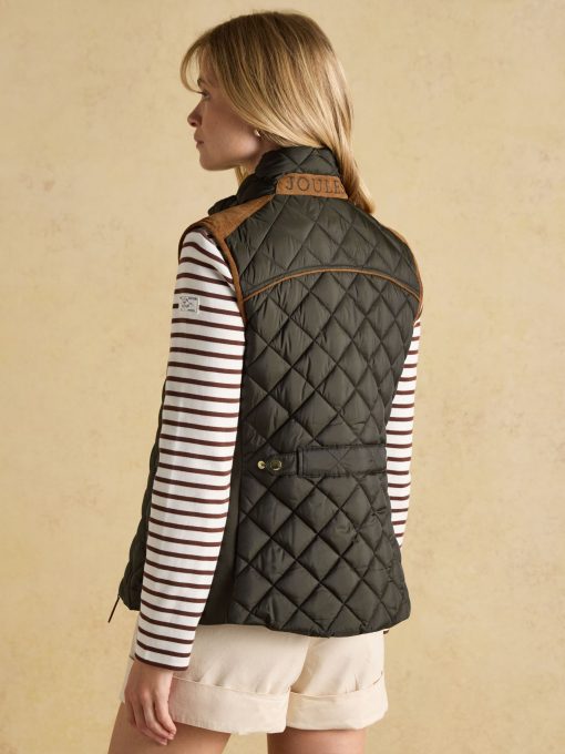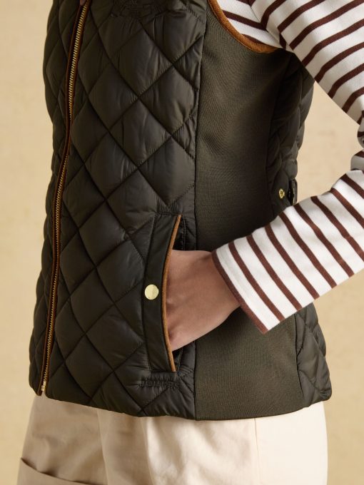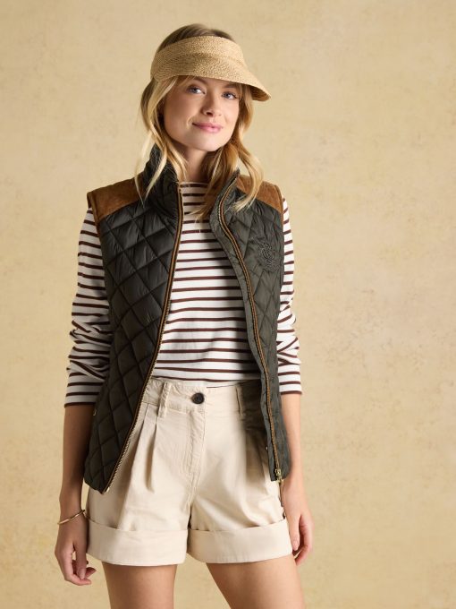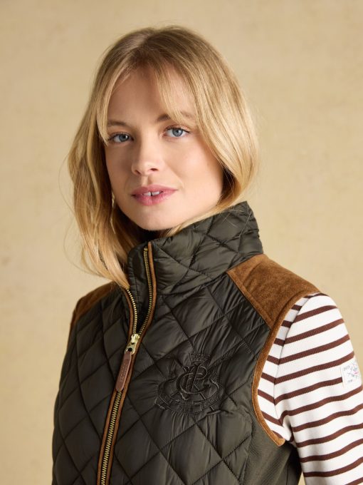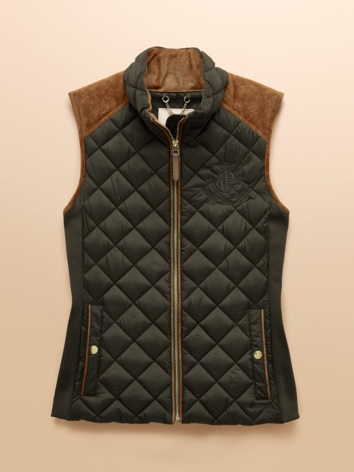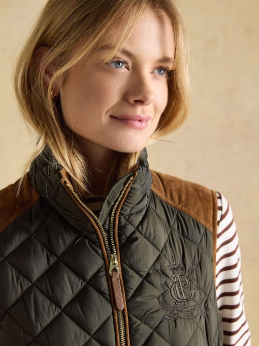 A true celebration of our rural heritage and style, this gilet in navy really does go the extra country mile. Showerproof (meaning a little rain won't stop play) and in a traditional diamond quilt pattern, it comes in a flattering silhouette and is home to well-considered detail and functional features. Suedette details offer a little change in texture, the intricate crest embroidery is a reminder of the quality and craft and the quilted back belt is further proof that this gilet is more than just a gilet – it's an expression of true countryside style. Showerproof Diamond quilted Funnel neck with suedette lining Zip fastening Suedette on shoulders Crest embroidery Adjustable back belt Front pockets with popper fastenings Curved hem with lower back