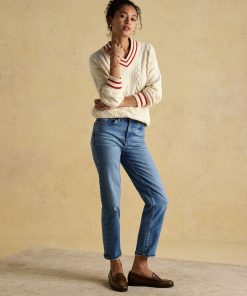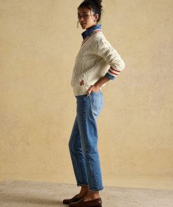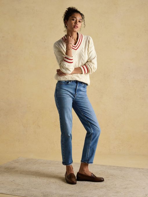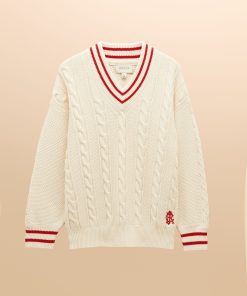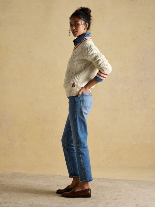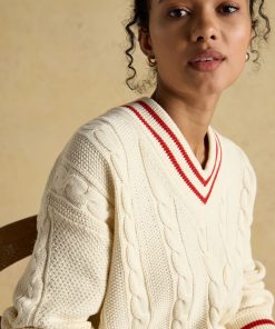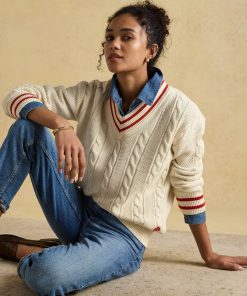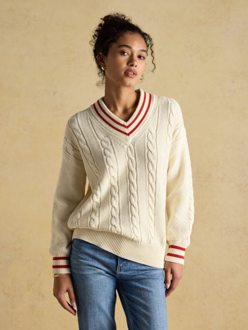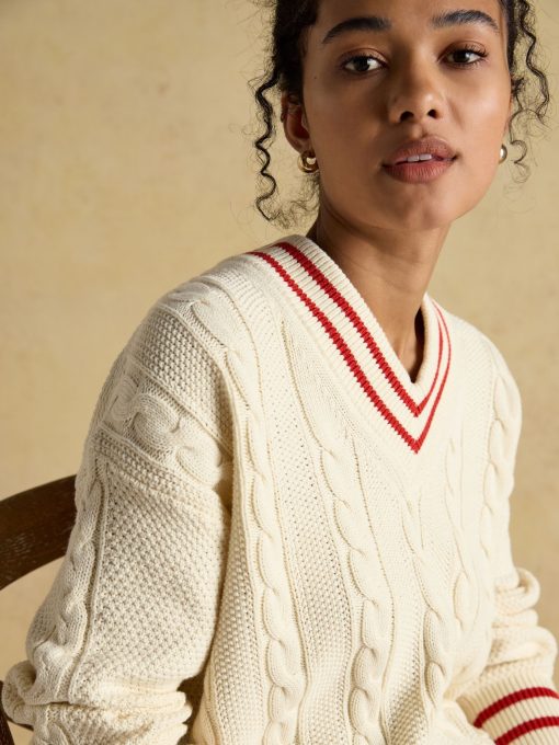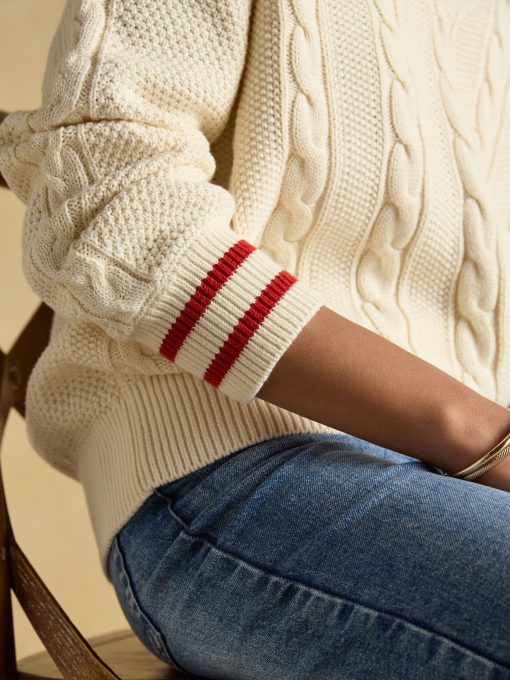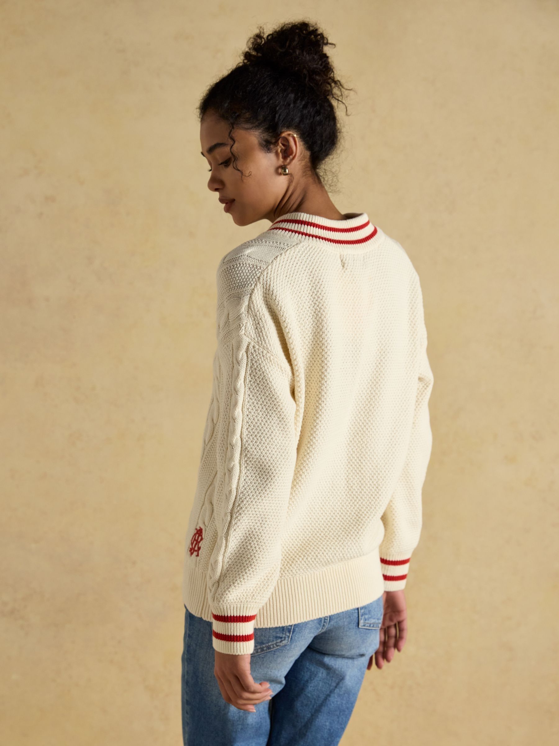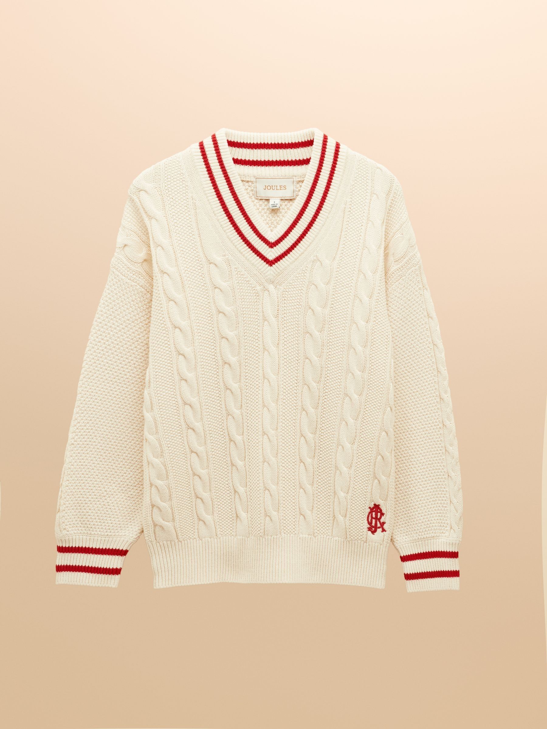 Drawing style influence from the world of cricket, the Dibbly relaxed fit knitted jumper will help you achieve a sporty look this season. It carries details synonymous with the sport including a deep ribbed V-neck with contrasting stripes and uses a classic cable knit technique to the body and sleeves along with a textured moss stitch throughout. Its 100% cotton construction makes it an enduring piece that will live long in your wardrobe. It's completed with a ribbed hem and ribbed cuffs with striped detailing. Cotton Relaxed fit Cable knit to the body and sleeves Moss stitch technique to the back V-neck with striped detailing Ribbed cuffs with striped detailing Ribbed hem