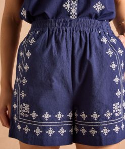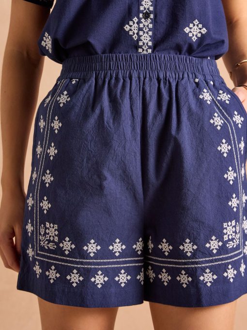 A pair of shorts you'll wear at every opportunity this summer. They're made from 100% cotton, have a flattering a-line shape and an elasticated waist that can be cinched with the drawcord ties. Embroidery detailing to the side and hem give them an elevated look and feel. Finished with side pockets. Style with a linen shirt or a classic t-shirt for a look you'll never tire of wearing. 100% cotton A-line shape Elasticated waist Drawstring ties Side pockets Embroidered detailing to the side and hem