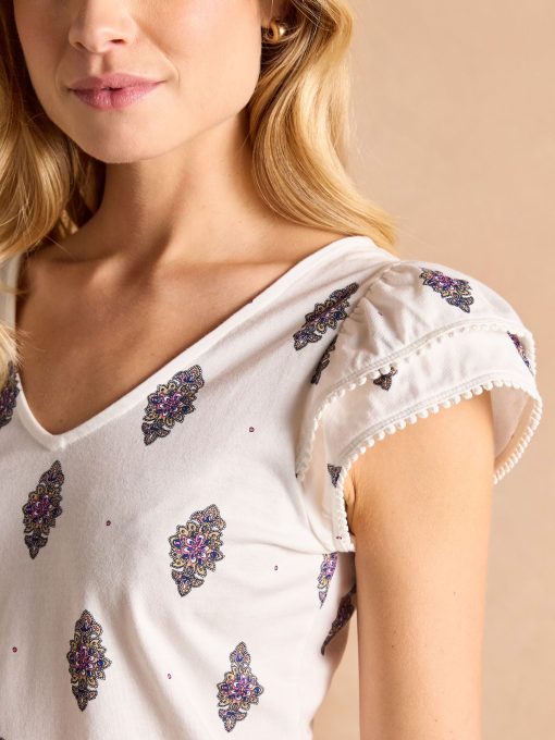 The Emma vest is a summer staple, elevated with feminine details. It's crafted from 100% cotton jersey, has a classic fit through the body and a flattering v-neck with a plunged v-shaped back neck. The double frill sleeves add both structure and interest and have been finished with a pom pom trim. Style with jeans or shorts for an effortless look that you'll wear over and over again. 100% cotton jersey Classic fit V-neck Double frilled sleeves with pom pom trim