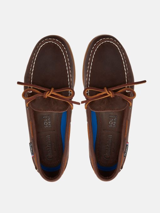 Olivia in rich chocolate nubuck, is a stylish design in Chatham's G2 collection, which is famed for its long-lasting, high quality shoes. This super-soft deck shoe is crafted from premium nubuck leather in chocolate brown with a matching collar and heel counter, brown leather laces and a non-slip rubber sole. It has a classic moccasin construction which is hand stitched on the last and also features their new sole spring poron performance cushioning, which is anti-bacterial and offers maximum comfort and shock absorption. Designed with a nautical lifestyle in mind, don't sail off without a pair.