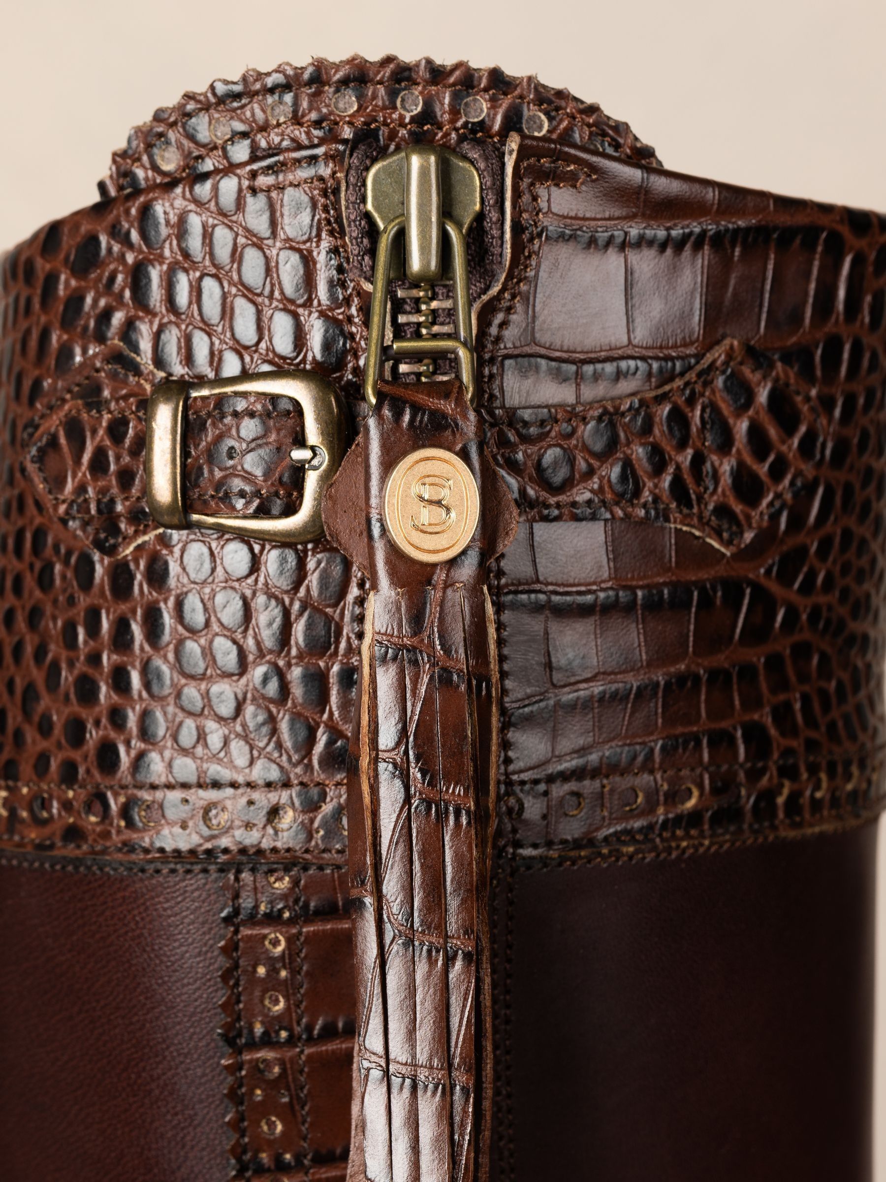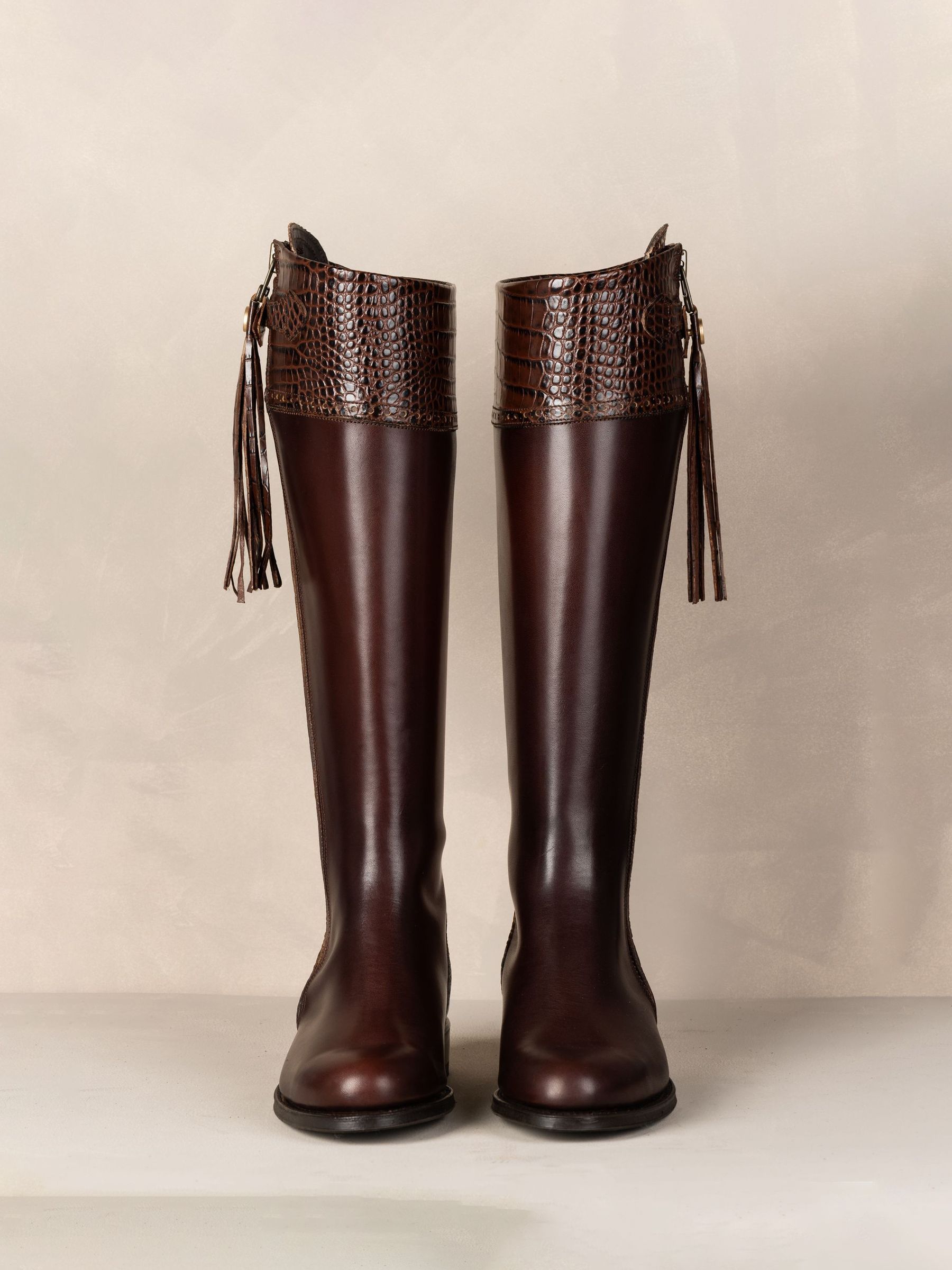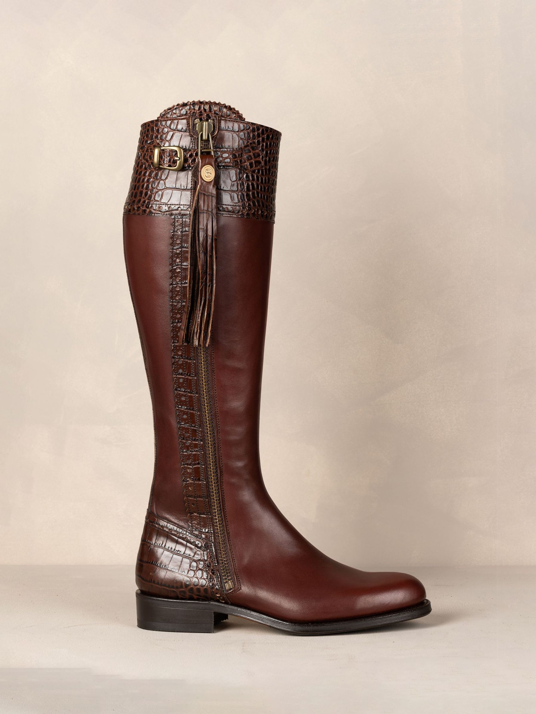 Classic in black or brown these Tall Leather Spanish Riding Boots have all the embellishments in mock croc giving real texture to the detail! This adds a new dimension to the Spanish Riding Boot style. Knee high leather boots. Tall Spanish Riding Boot with Mock Croc details. Full length outside zip, curved at the bottom. Traditional fan and Spanish brogue detail. Good-year welted leather sole with integral cork layer for a natural breathable foot bed to aid ergonomic and anatomical support. Handcrafted in Southern Spain, due to this there may be slight variances in colour and fitting. Please select your usual UK shoe size. Calf Width* UK 3 35-36cm UK 4 35-36cm UK 5 36-37cm UK 6 37-38cm UK 7 37-38cm UK 8 38-39cm UK 8.5 39-40cm UK 9 40-41cm UK 10 41-42cm Calf width* = circumference of leg at widest point (cm) The Standard Calf boot is a generous fit on the foot and calf – if you are a half size we would suggest going down to the nearest full size. Heel height 2cm.