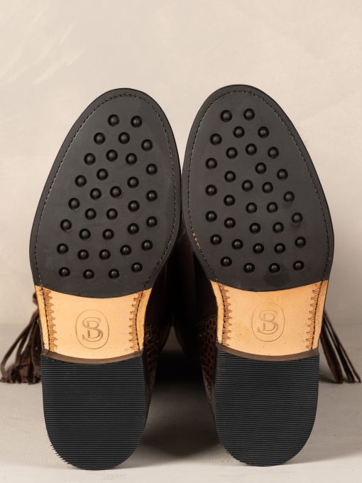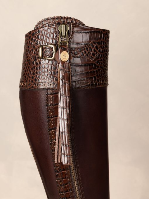 Classic in black or brown these Tall Leather Spanish Riding Boots have all the embellishments in mock croc giving real texture to the detail! This adds a new dimension to the Spanish Riding Boot style. Knee high leather boots. Tall Spanish Riding Boot with Mock Croc details. Full length outside zip, curved at the bottom. Traditional fan and Spanish brogue detail. Good-year welted leather sole with integral cork layer for a natural breathable foot bed to aid ergonomic and anatomical support. Handcrafted in Southern Spain, due to this there may be slight variances in colour and fitting. Please select your usual UK shoe size. Calf Width* UK 3 35-36cm UK 4 35-36cm UK 5 36-37cm UK 6 37-38cm UK 7 37-38cm UK 8 38-39cm UK 8.5 39-40cm UK 9 40-41cm UK 10 41-42cm Calf width* = circumference of leg at widest point (cm) The Standard Calf boot is a generous fit on the foot and calf – if you are a half size we would suggest going down to the nearest full size. Heel height 2cm.