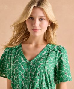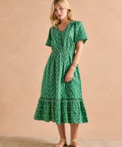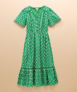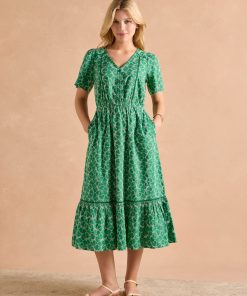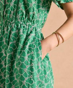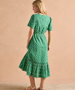 Style and summer combined. This dress is perfection for the season. Falling to a midi length and made from quality cotton it's endlessly versatile. It's full of details from the all over broderie anglaise, to the latter trim and tiered hem, all of which make it an attention-grabbing piece. A gathered waist nips it in at the waist creating a flattering silhouette and short flutter sleeves adds a feminine finish. 100% cotton All over broderie anglaise cutwork Short, flutter sleeves V-neck Button placket Gathered waist Ladder trim detailing Tiered hem