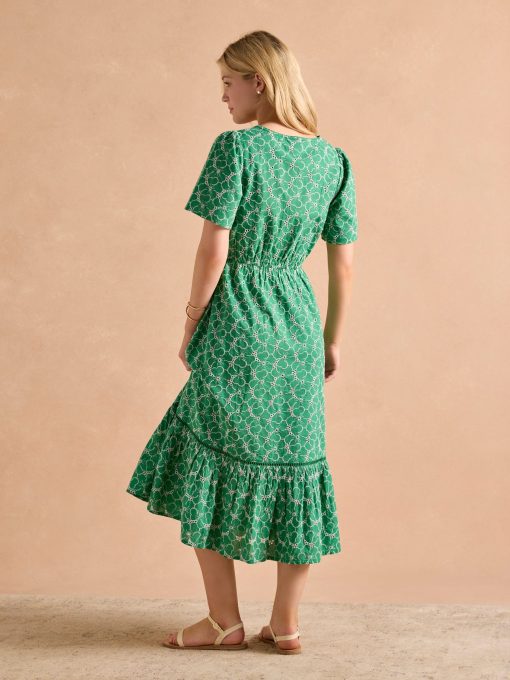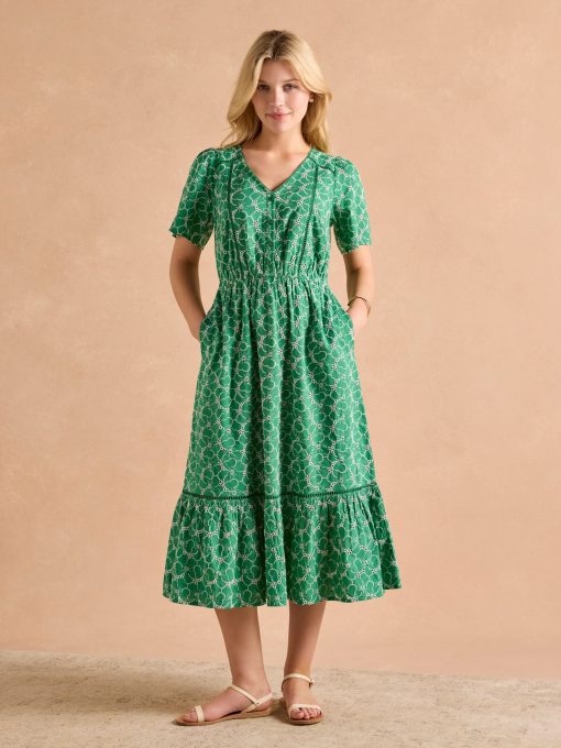 Style and summer combined. This dress is perfection for the season. Falling to a midi length and made from quality cotton it's endlessly versatile. It's full of details from the all over broderie anglaise, to the latter trim and tiered hem, all of which make it an attention-grabbing piece. A gathered waist nips it in at the waist creating a flattering silhouette and short flutter sleeves adds a feminine finish. 100% cotton All over broderie anglaise cutwork Short, flutter sleeves V-neck Button placket Gathered waist Ladder trim detailing Tiered hem
