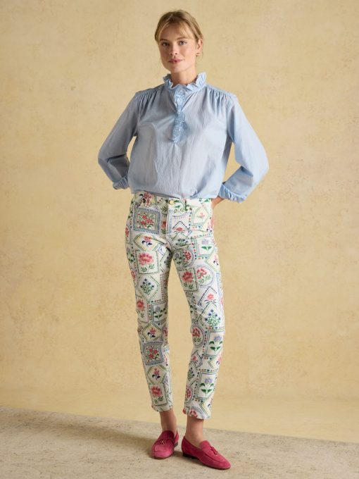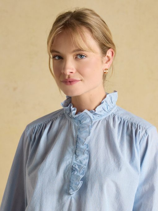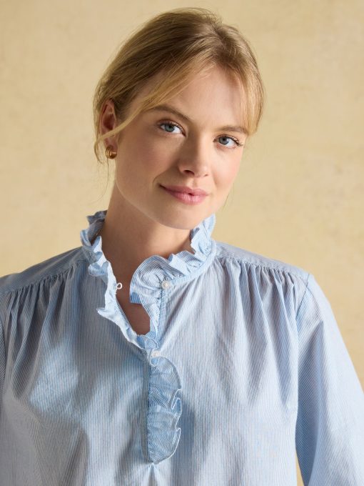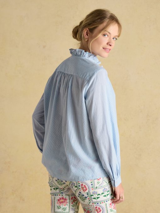 The Melanie blouse will be a timeless piece in your wardrobe that you'll come to rely on for any affair. It's been lovingly crafted from quality cotton voile for a lightweight feel. The concealed button placket allows for versatile styling and has an elegant frilled trim which extends to the neckline and will look great peeking out from a layered-on sweatshirt or knit. It has long sleeves with button cuffs and gentle gathering to the shoulders, cuffs and back. This is a style that can stay with you all year round. Cotton voile Woven Lightweight Long sleeves with button cuffs Concealed button placket Frill trim to the placket and neckline Gentle gathering to the shoulders, cuffs and back