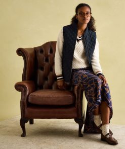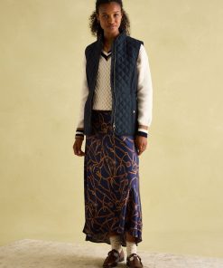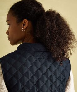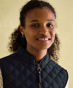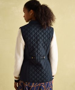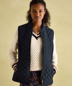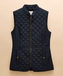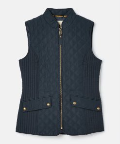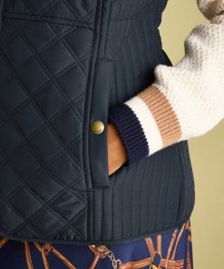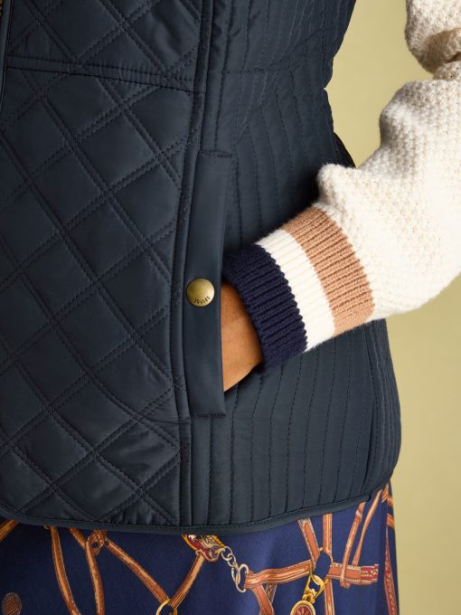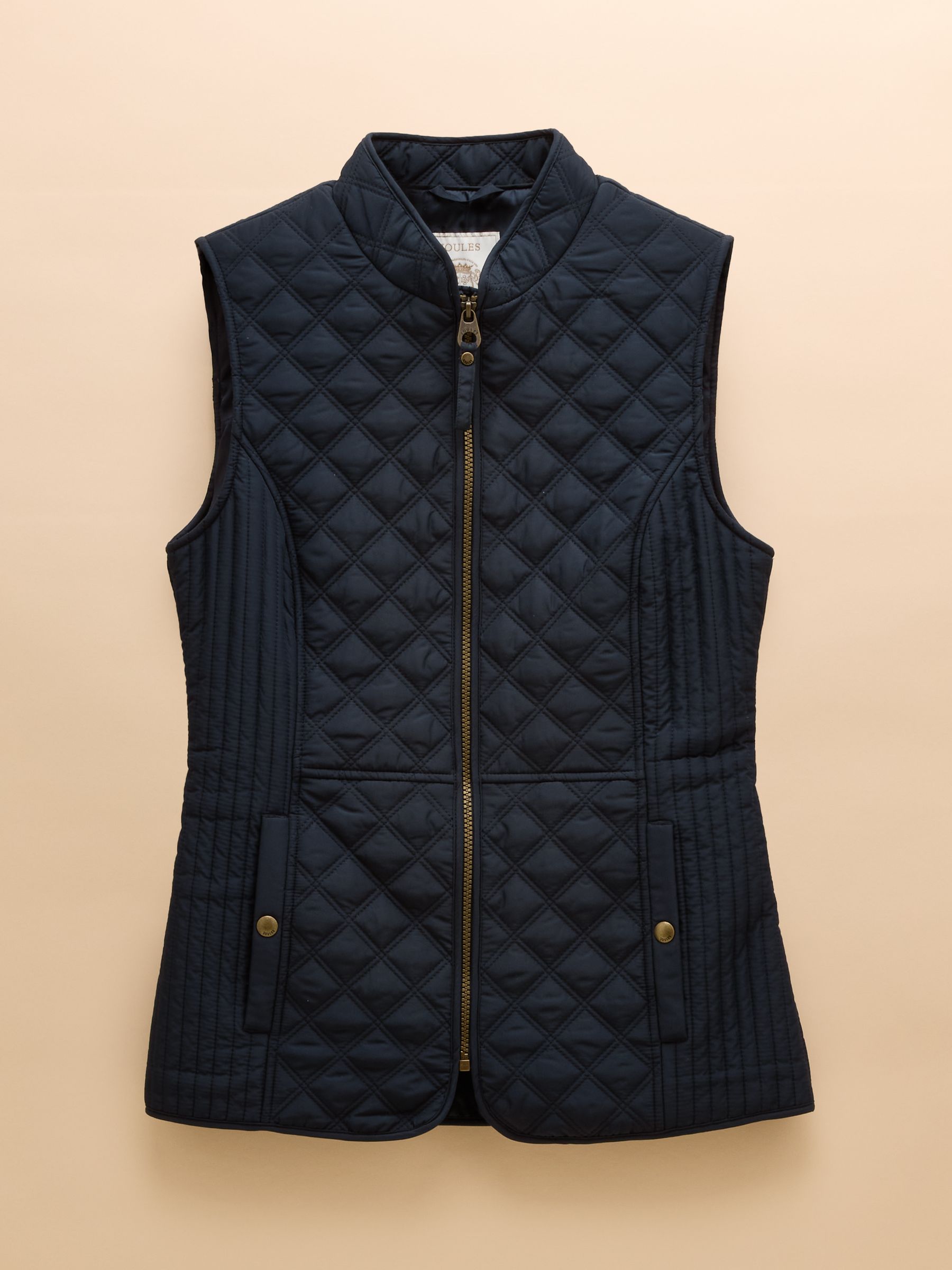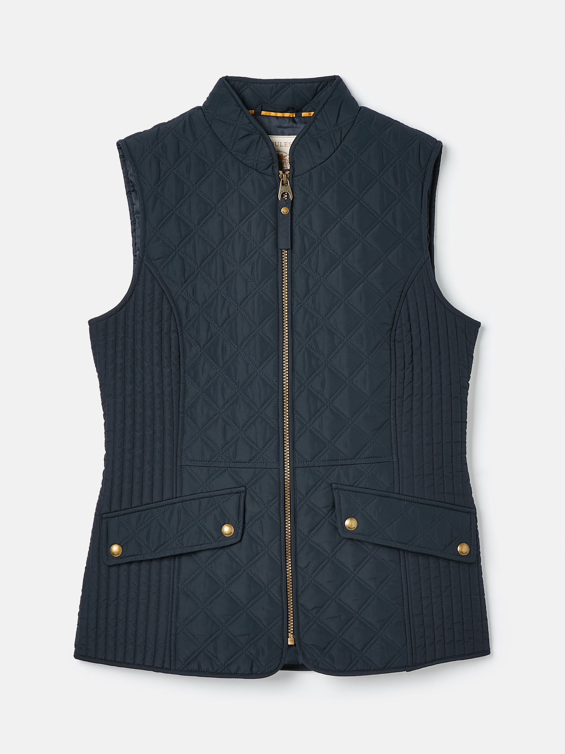 Our Minx navy blue gilet is a much-loved outdoor essential, perfectly made for popping into town or strolling through fields with the dog. This all-year-round layering piece has diamond quilting, a zip-through fastening, welt pockets with exposed metal poppers and an elasticated back channel. For a shape that's as flattering as it is comfortable, there are fitted side panels to each side too. Woven Diamond quilting Zip fastening Fitted side panels for a flattering look Front flap pockets with metal poppers Elasticated back channel with popper-adjusted tabs Joules embroidered hare to the hem