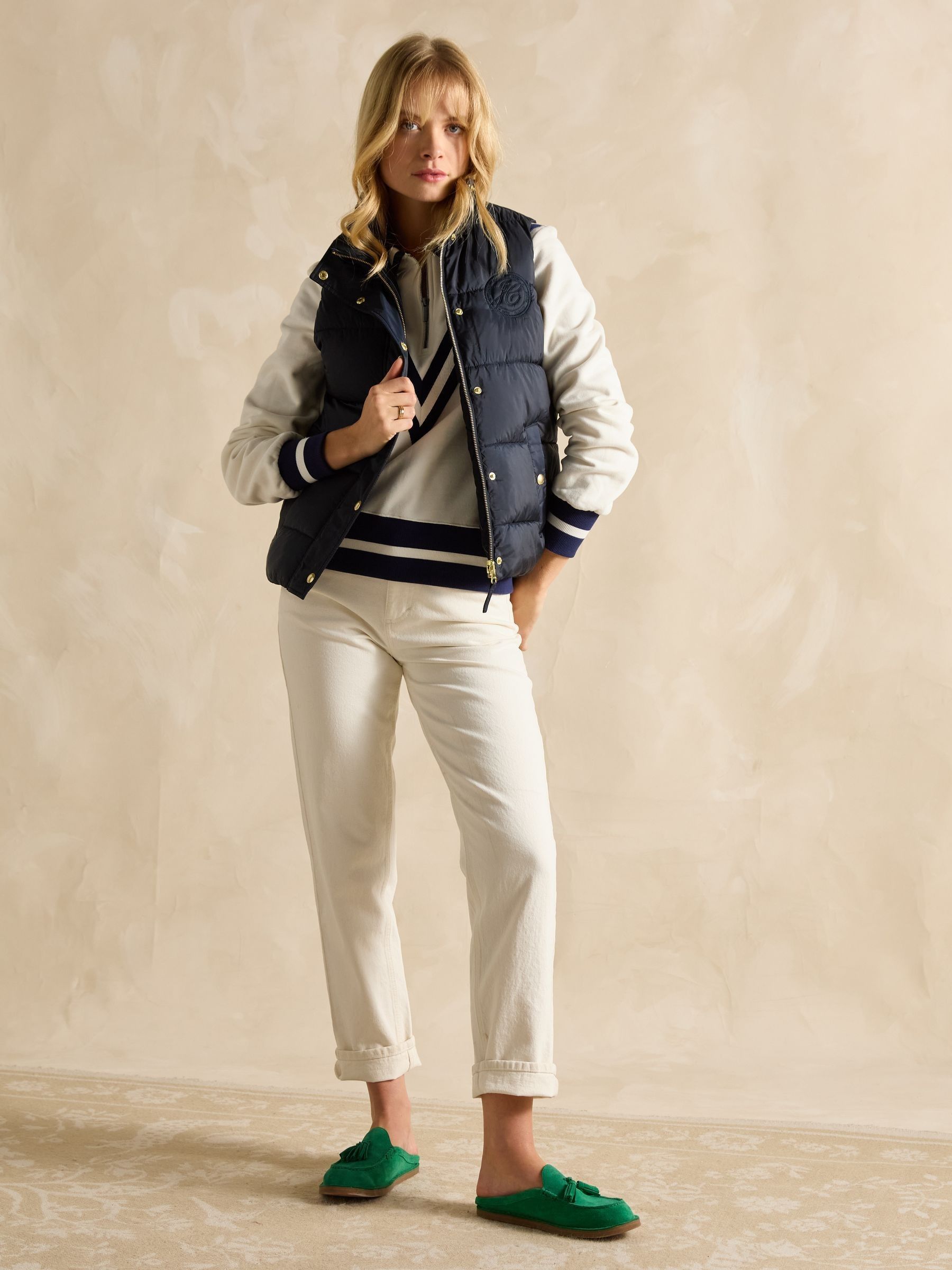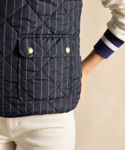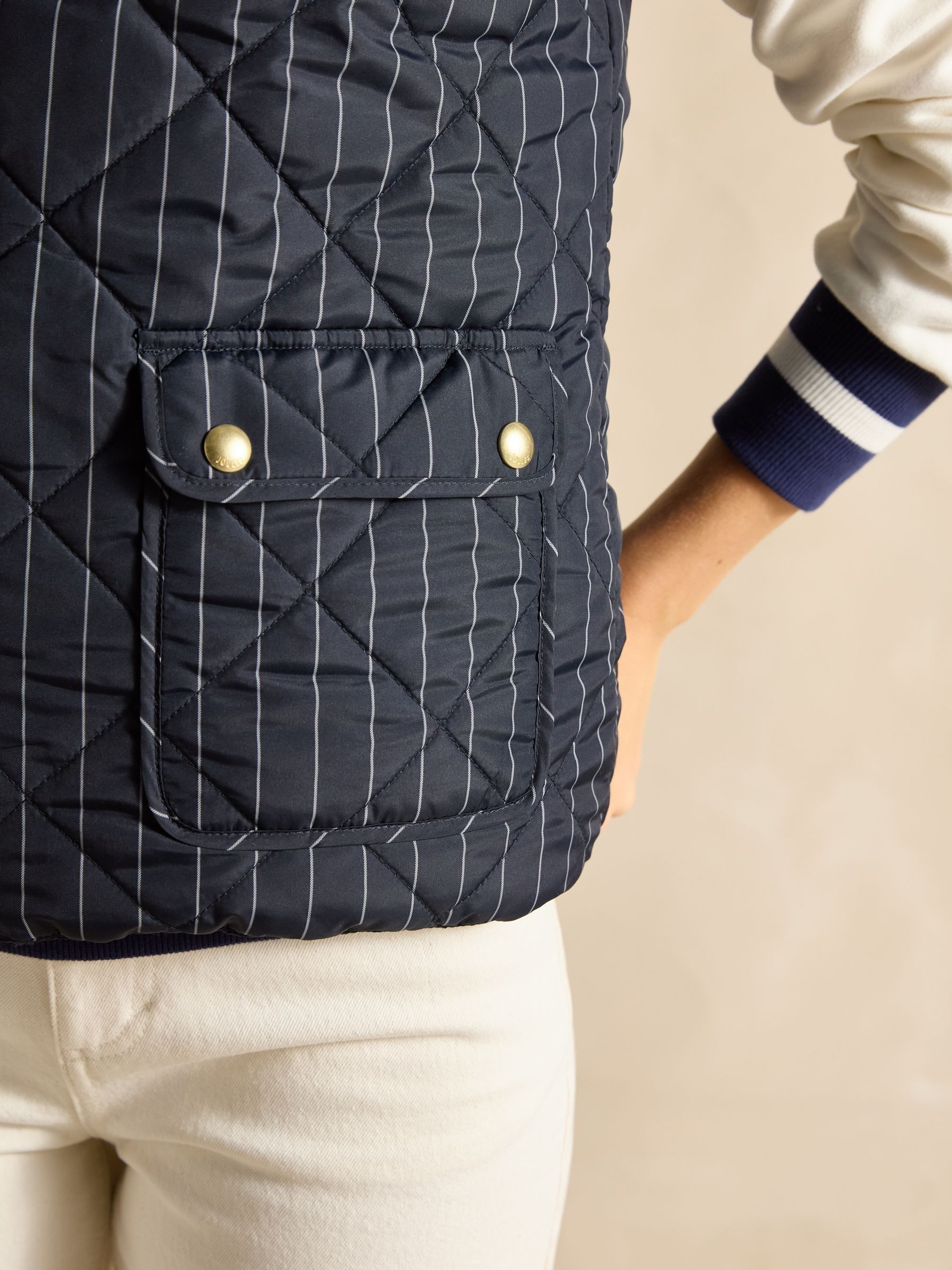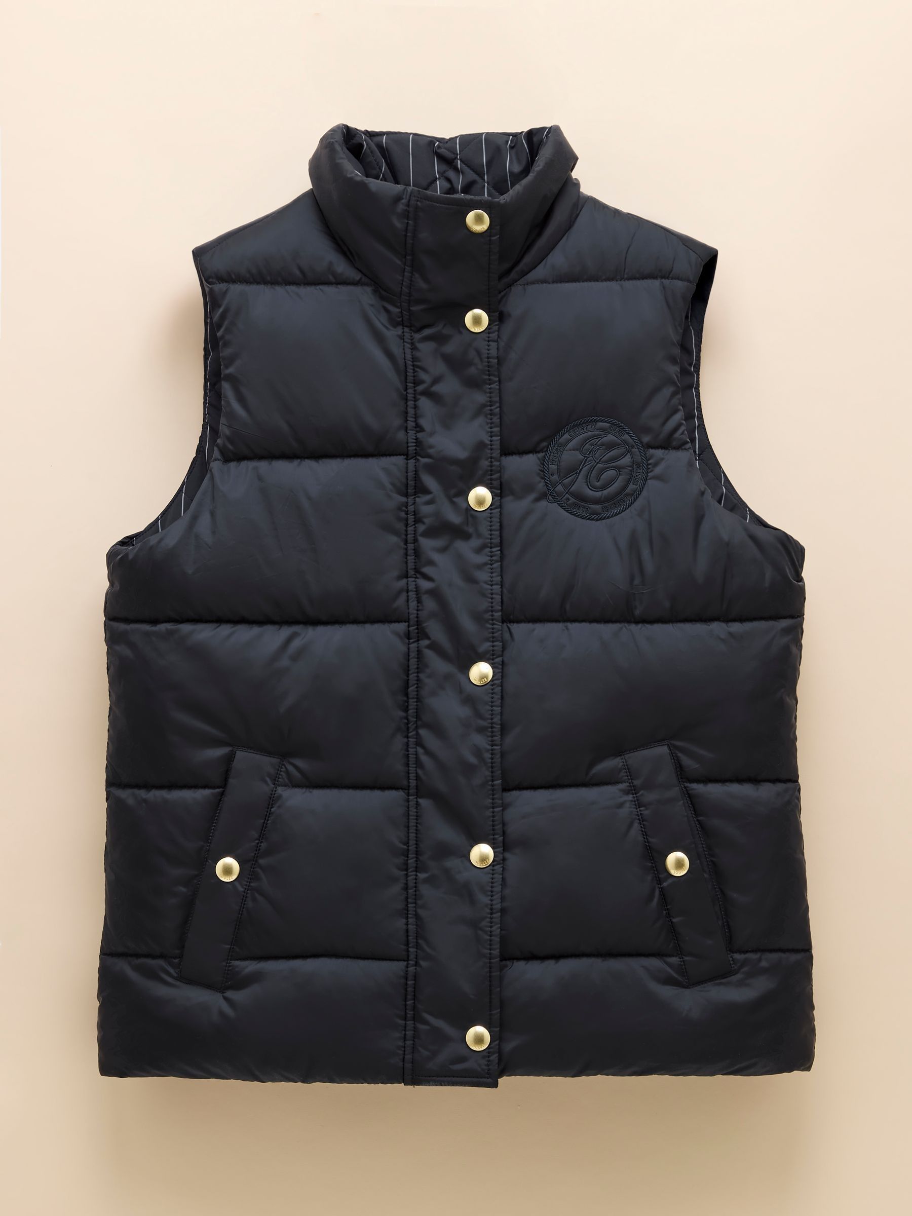This reversible gilet gives you two different looks in one functional style. The neutral side features barrel padding, a popper fastening, two side pockets with poppers and a Joules branded emblem to the chest. Its reverse showcases a pattern for a contrasting look, has classic diamond quilting and a zip fastening. The flap pockets fasten via double poppers in a different design to the reverse. The perfect way to switch up your style in an instant. Reversible gilet. Neutral side:. Barrel padding. Popper fastening. Slip-in side pockets with popper fastenings. Joules branded emblem to the chest. Patterned side:. Diamond quilting.Zip fastening. Front flap pockets with double popper fastenings.
