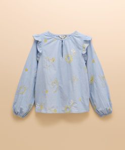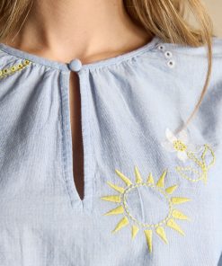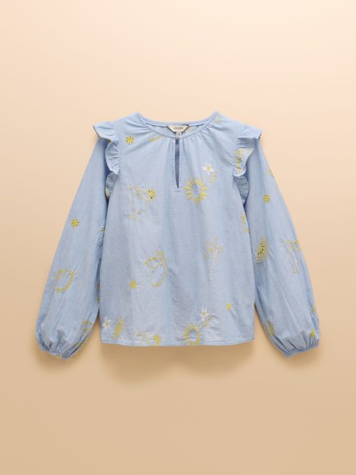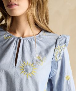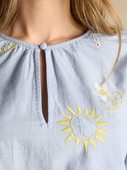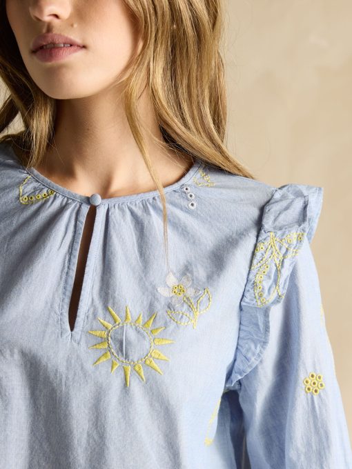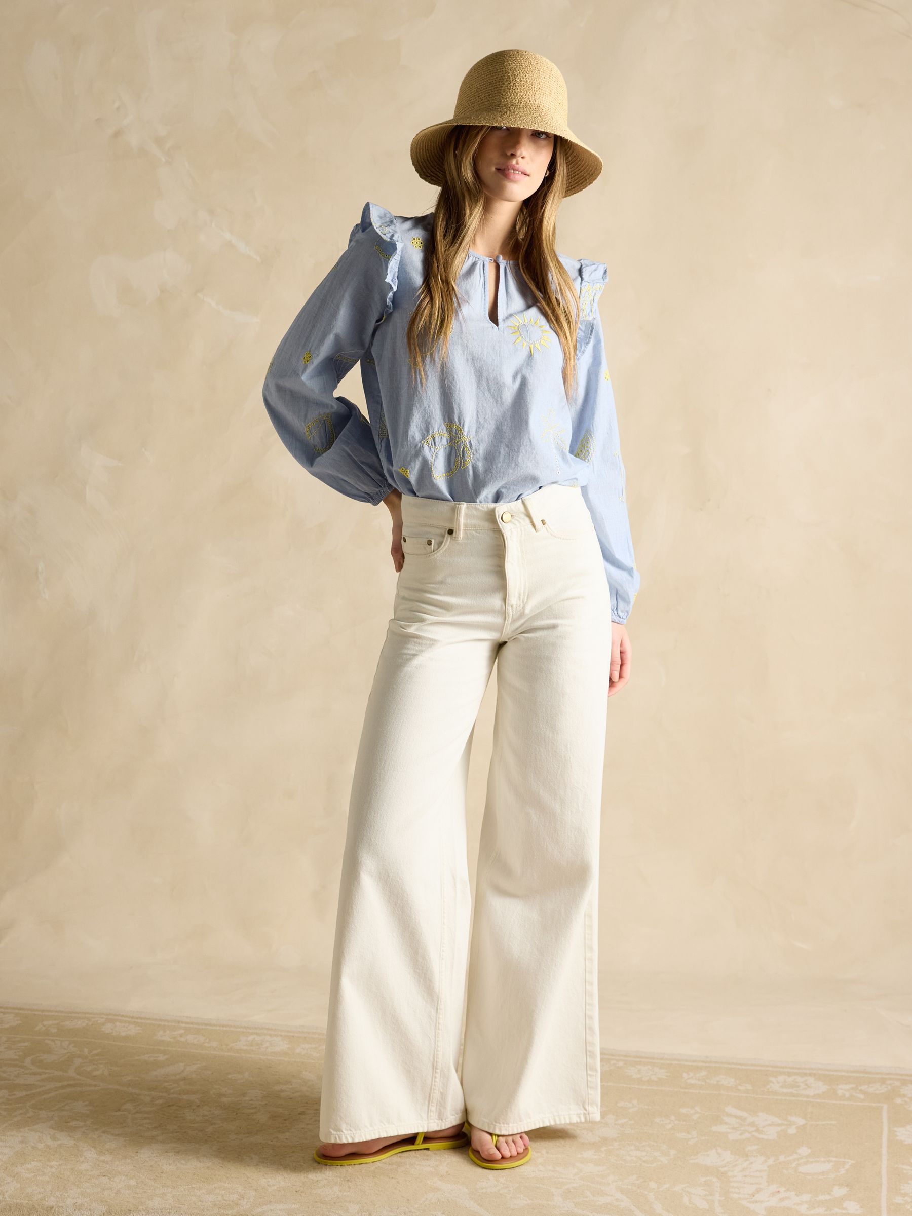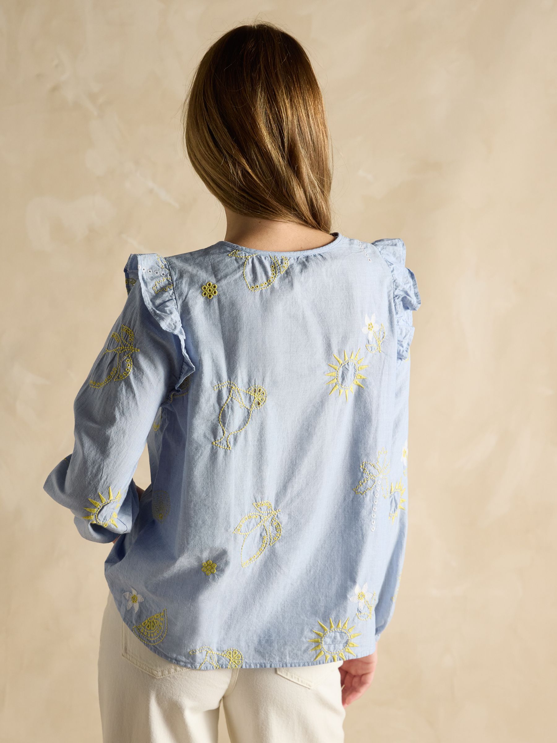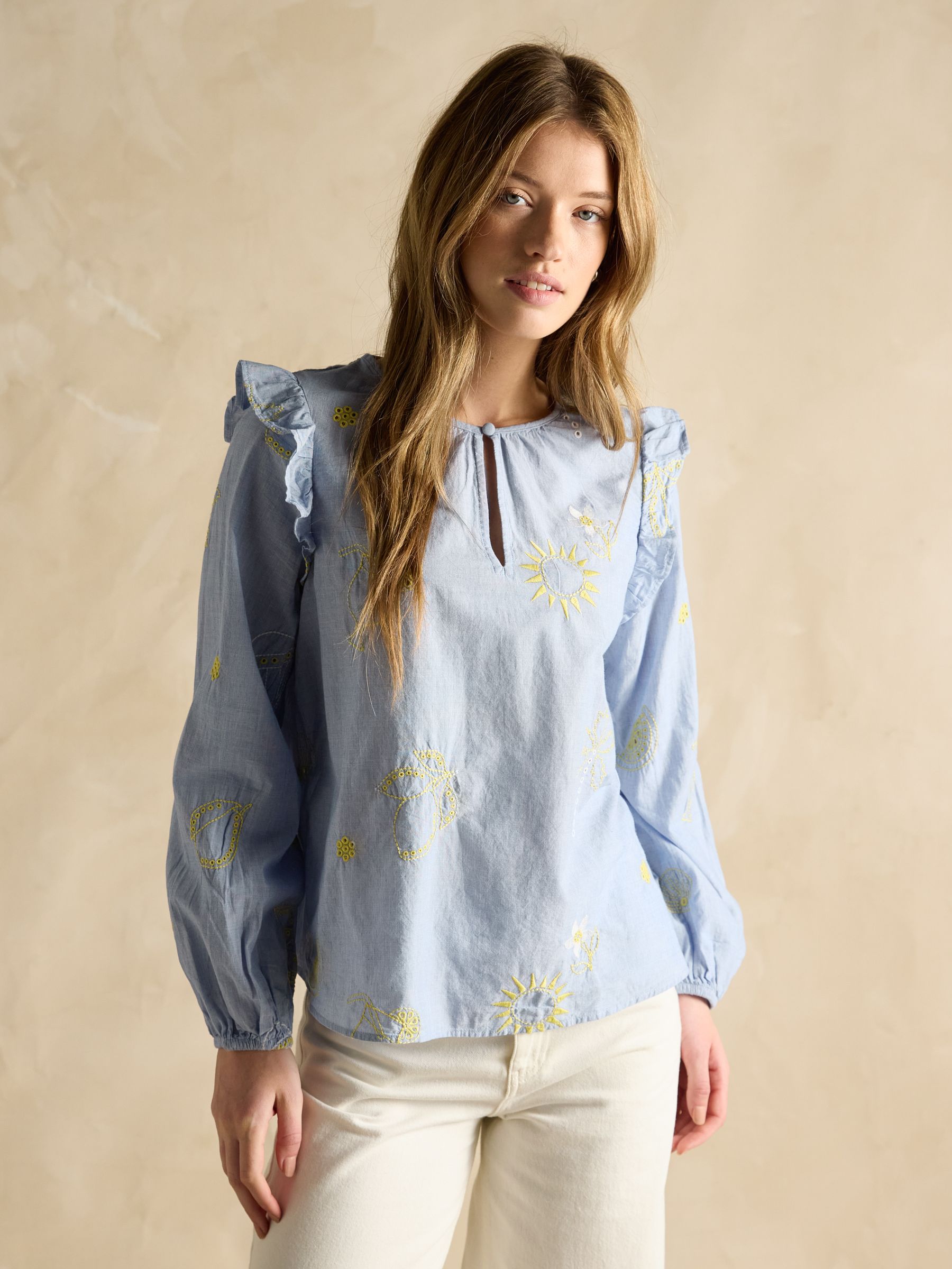 This is summer loving in a blouse. Crafted from light and soft 100% cotton chambray, it's the perfect piece to wear as you head into the warmer weather. It's adorned with sunshine-yellow embroidery, from zesty lemons to seashells, which will be a conversation starter every time you show it off. As for the fit, it's relaxed through the body, long sleeves that balloon elegantly at the cuffs and has a notch neckline. The ruffle trim to each shoulder adds another elevated detail that will ensure this remains a favourite for many summers to come. 100% cotton chambray Long, slightly blouson sleeves Notch neck Ruffle trim to each shoulder Embroidery detailing throughout