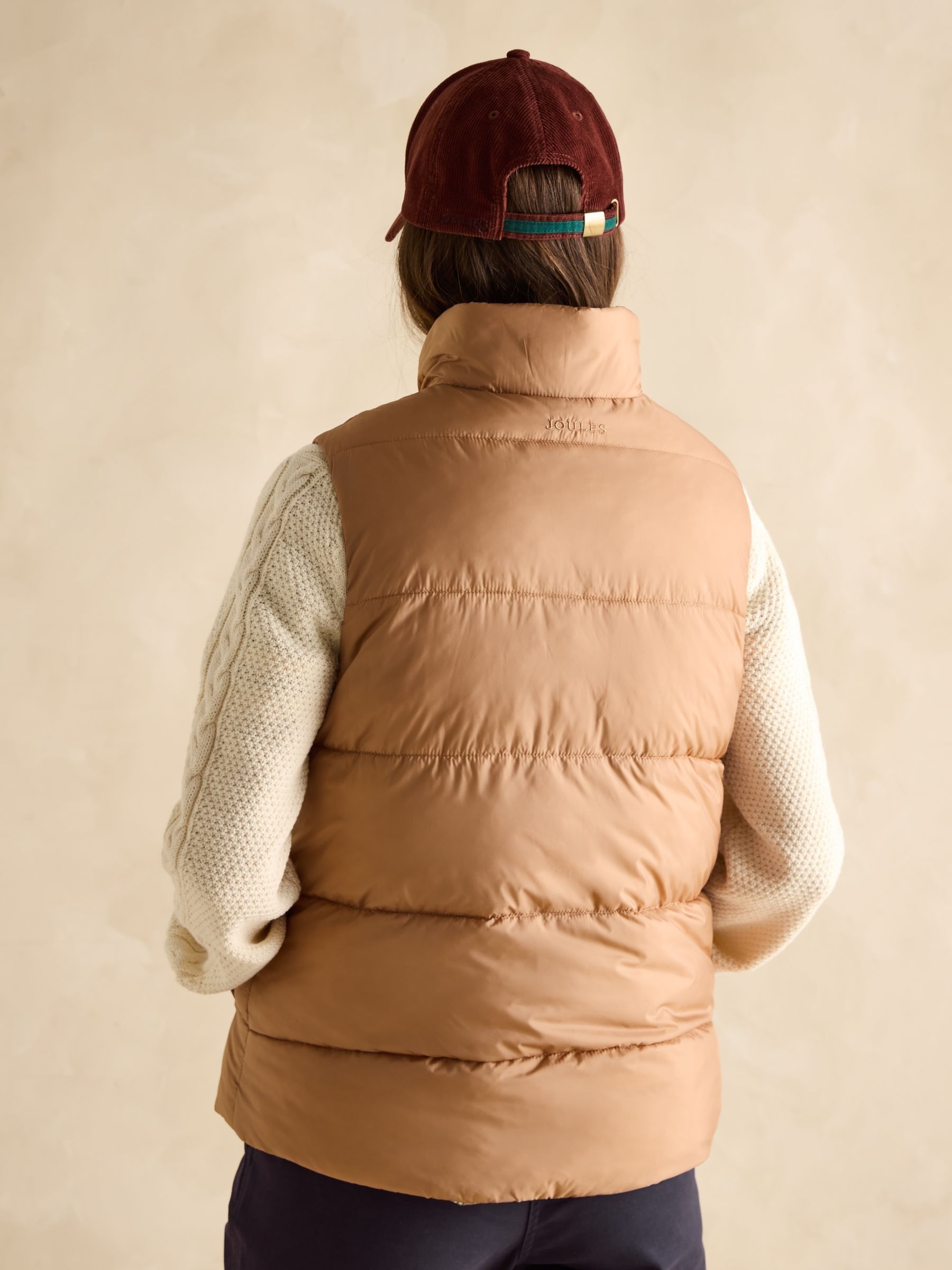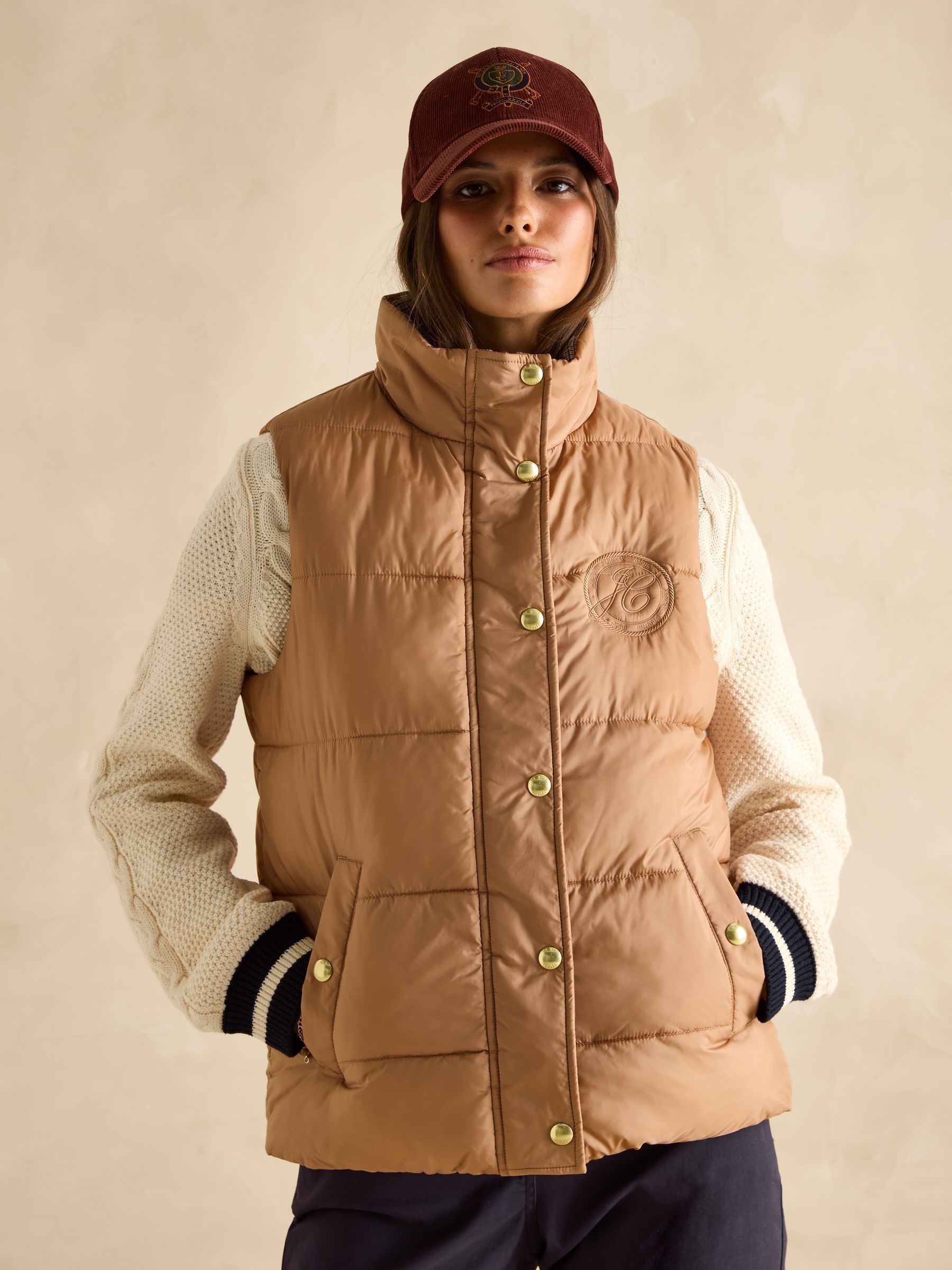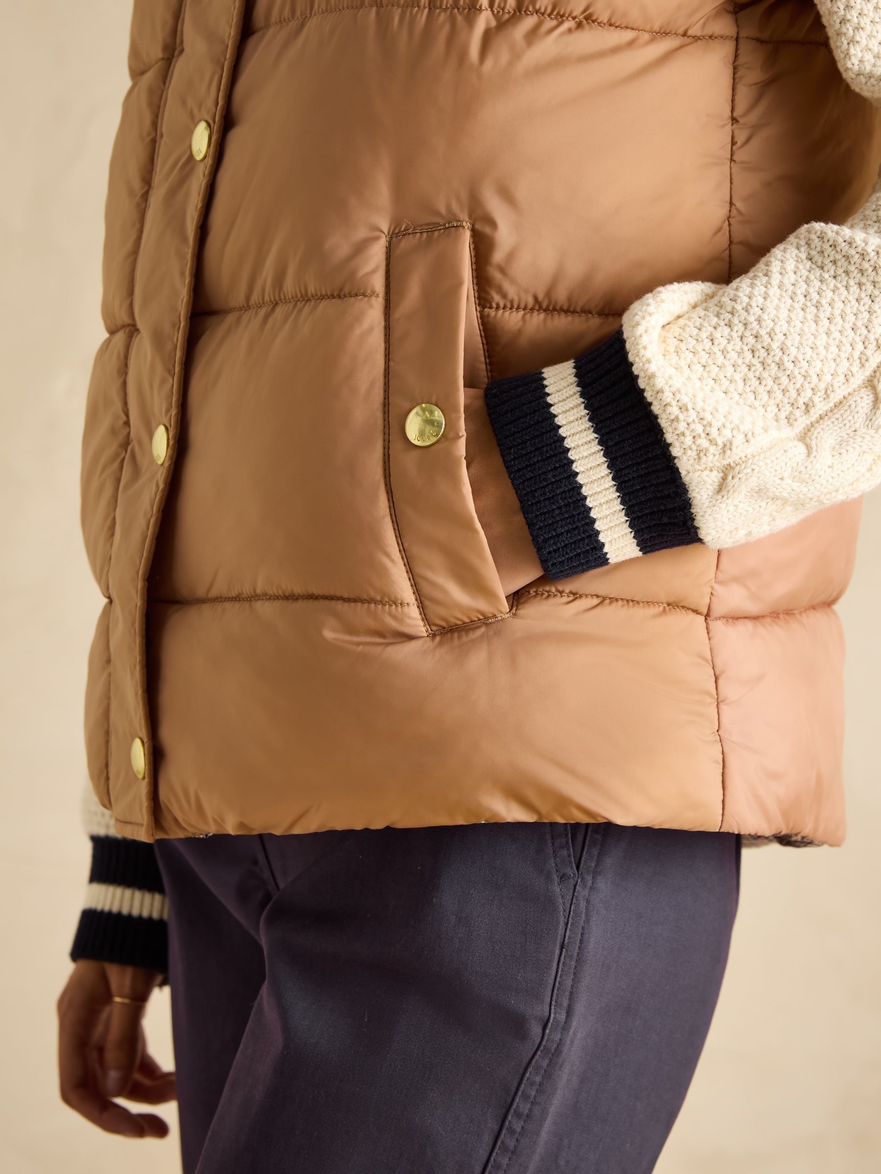 This reversible gilet gives you two different looks in one functional style. The neutral side features barrel padding, a popper fastening, two side pockets with poppers and a Joules branded emblem to the chest. Its reverse showcases a pattern for a contrasting look, has classic diamond quilting and a zip fastening. The flap pockets fasten via double poppers in a different design to the reverse. The perfect way to switch up your style in an instant. Reversible gilet. Neutral side:. Barrel padding. Popper fastening. Slip-in side pockets with popper fastenings. Joules branded emblem to the chest. Patterned side:. Diamond quilting.Zip fastening. Front flap pockets with double popper fastenings.