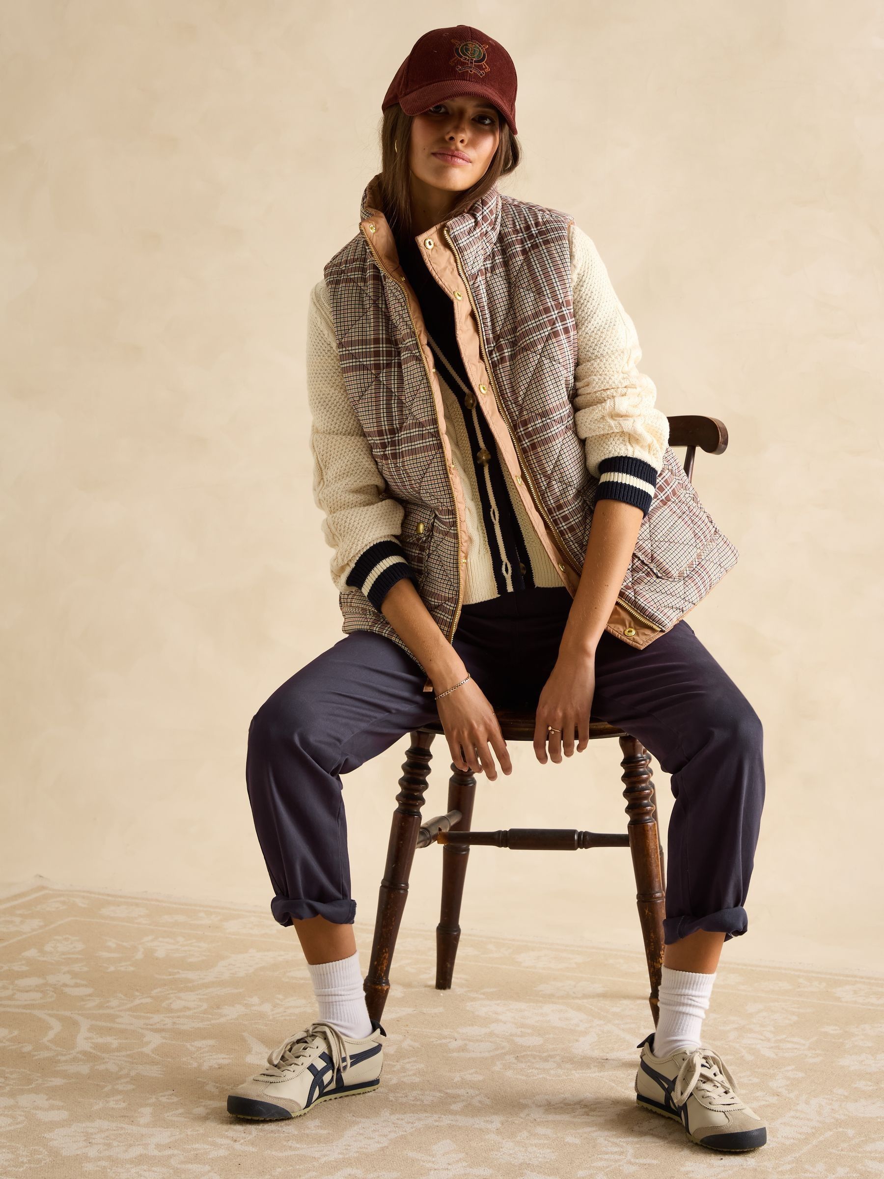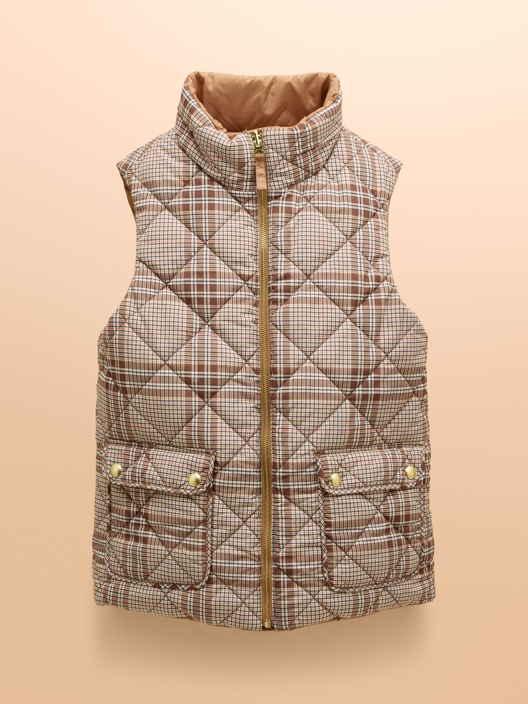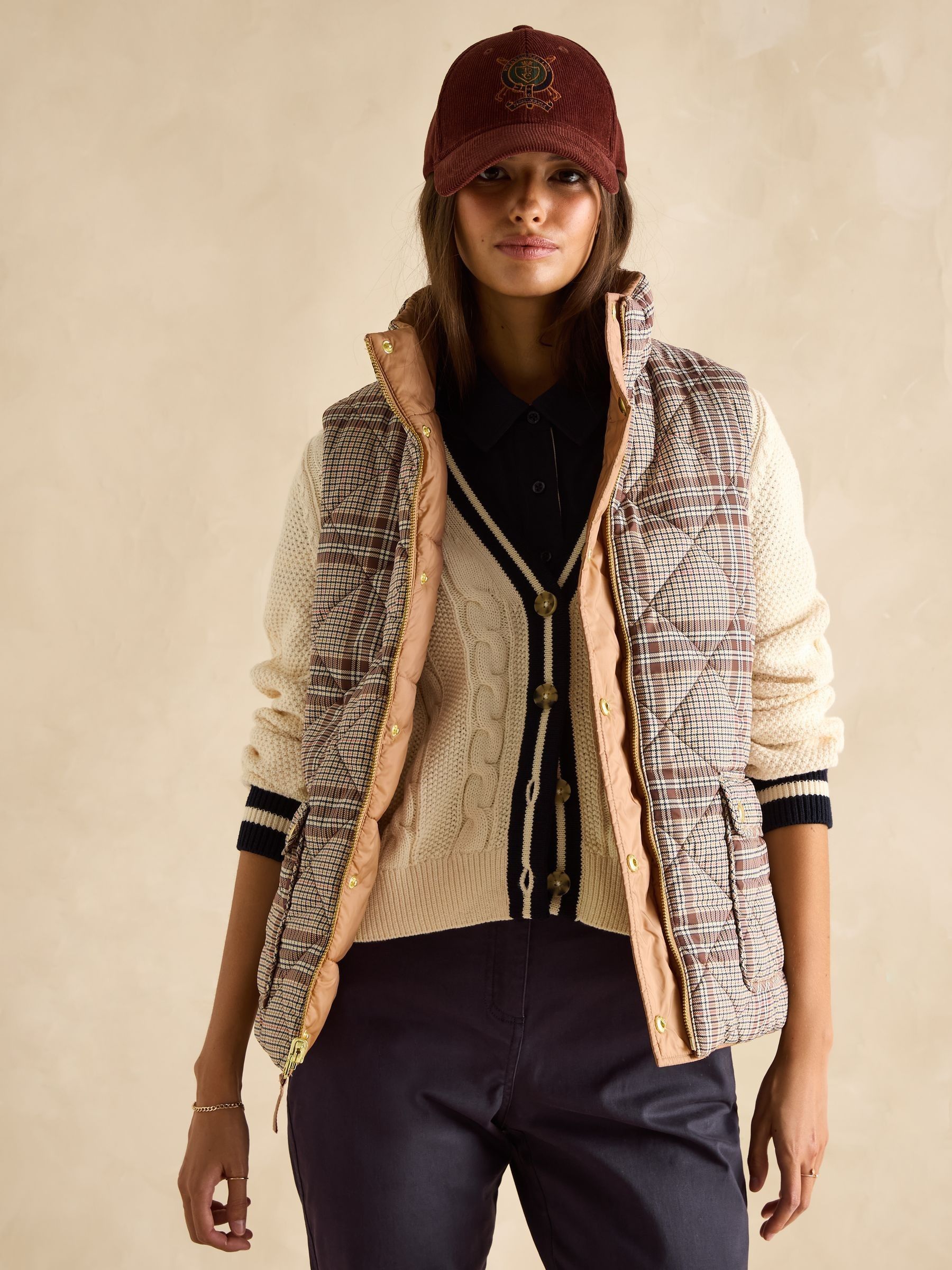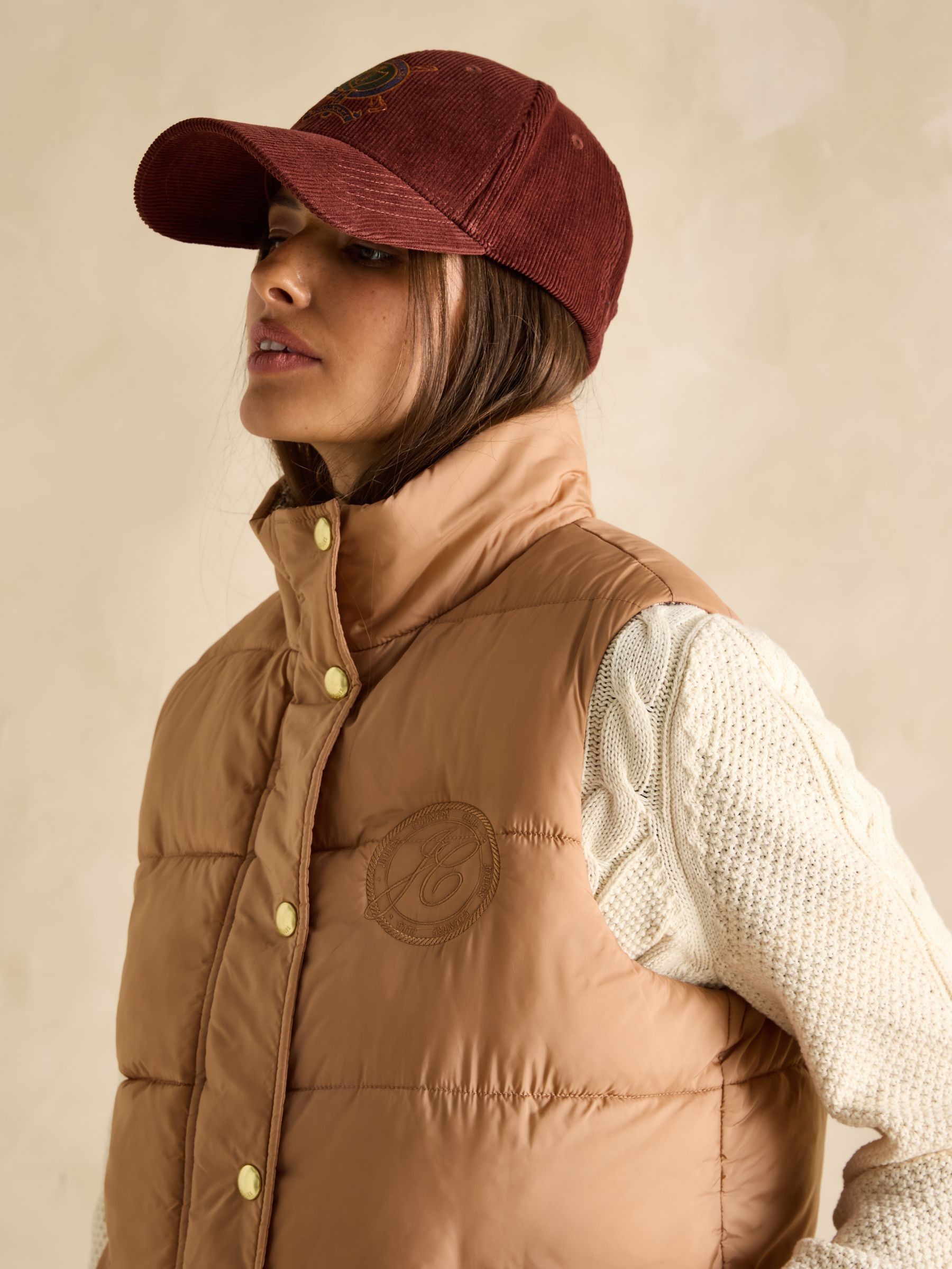 This reversible gilet gives you two different looks in one functional style. The neutral side features barrel padding, a popper fastening, two side pockets with poppers and a Joules branded emblem to the chest. Its reverse showcases a pattern for a contrasting look, has classic diamond quilting and a zip fastening. The flap pockets fasten via double poppers in a different design to the reverse. The perfect way to switch up your style in an instant. Reversible gilet. Neutral side:. Barrel padding. Popper fastening. Slip-in side pockets with popper fastenings. Joules branded emblem to the chest. Patterned side:. Diamond quilting.Zip fastening. Front flap pockets with double popper fastenings.