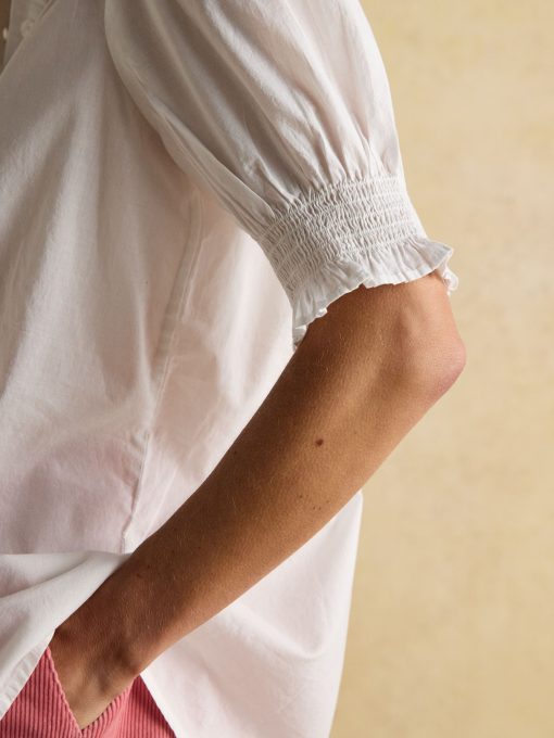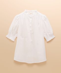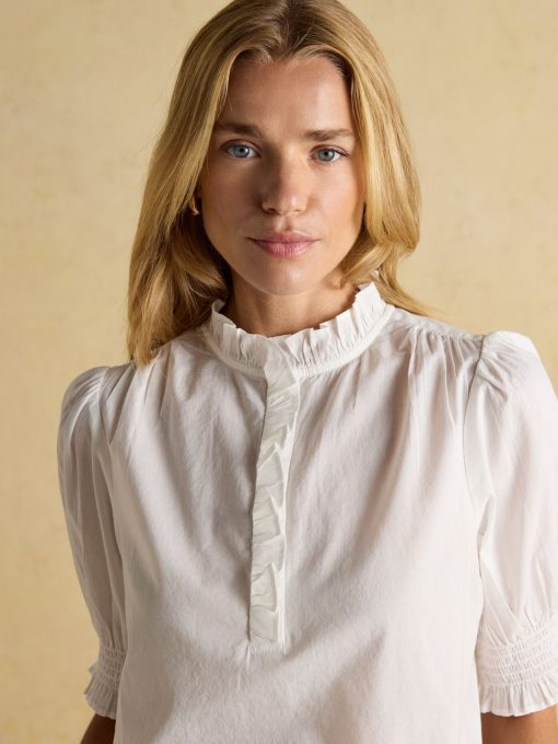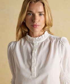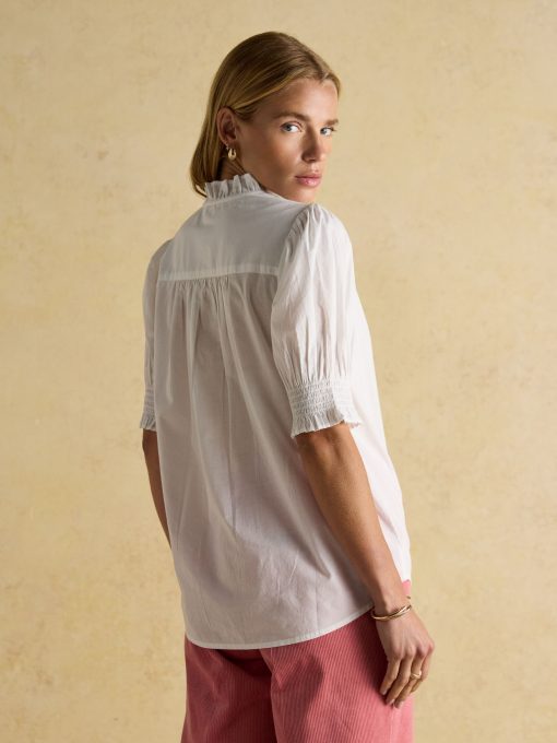 Our much-loved Melanie blouse – now with short sleeves. Perfect for the warmer months, our shirt is cut from 100% cotton and features an elegant frilled trim around the neckline that cascades into the button placket. Wear this chic piece underneath knitwear and jumpers with the frill showing to add a pop of individuality to your finished look.Cotton voile Woven Short sleeves Concealed button placket Frill trim to the placket and neckline Gentle gathering